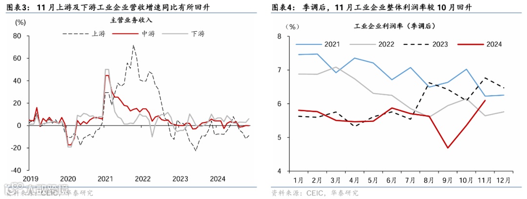 下游制造业利润同从10月的0.2%小幅回落至-3.5%,而营业收入增速较10月的2.8%回升至6%,季调后的利润率亦从10月的6.6%边际提升至6.7%,可能由于年末费用类开支调整、影响单月企业盈利数据。分行业中,汽车制造利润降幅较10月的17.3%走阔至35%,对整体工业企业利润同比的拖累约2.3个百分点,利润率从10月的4.1%再度回落至3.3%,营业收入增速则从10月的0.9%回升至8.6%,显示“以旧换新”等政策补贴对消费需求起到提振。计算机通信行业盈利主要受高基数影响,同比增速从10月的18.4%回落至-32.2%、对整体工业企业盈利增速的拖累约2.8个百分点,而11月计算机通信行业收入增速改善、出口增速亦保持2位数的增长,或体现出“以价换量”特征仍延续,利润率有所承压。