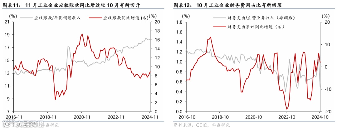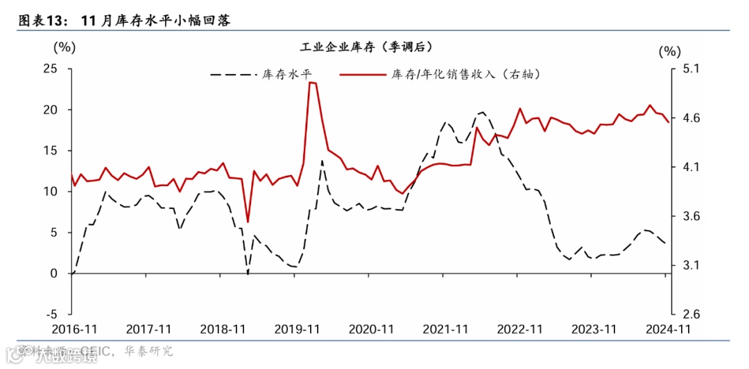 11月库存增速(季调后)从10月的4%回落至3.4%,或显示工业企业仍在去库存阶段;工业企业杠杆率(季调后)较10月小幅走高、而应收账款占销售收入比例较10月边际回落。具体看,11月工业企业总体资产负债率较10月的57.6%走高至57.7%,应收账款(与销售收入)比率则较10月边际回落0.1个百分点至18.2%(图表9,11,13)。