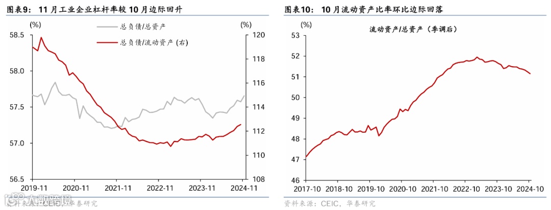 此外,今年前10个月工业企业亏损额同比增速较1-9月的累计同比增长12.7%进一步上行至13.8%,而10月财务费用占主营业务收入比例较9月有所回落。此外,今年前10个月财务费用同比增速较今年1-9月的6.1%回落至2%,季调后的流动资产比例亦边际下行(图表8-10,12,由于10月工业企业财务费用、流动资产和亏损额数据尚未更新,我们将在下月点评中一并更新)。