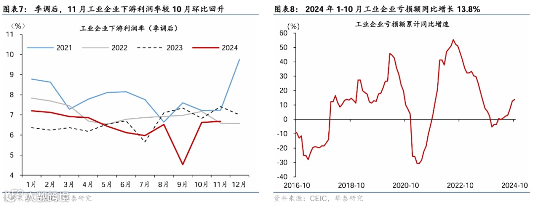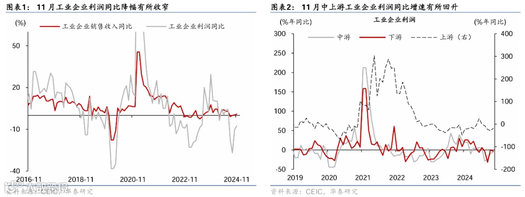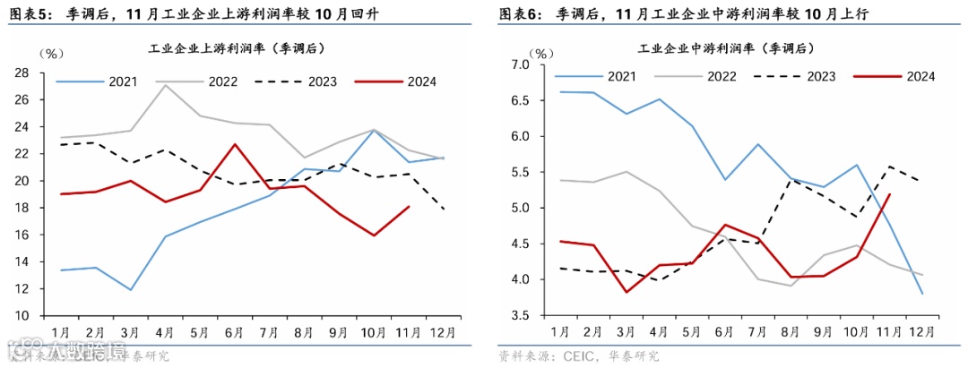 中游制造业利润同比降幅亦较10月的9.2%收窄至5.3%,主要受利润率提升的拉动——利润率(季调后)较10月的4.3%上行至年内高点5.2%、但营收增速较10月的0%略走弱至-0.1%。其中,石油加工/化学制品盈利降幅边际修复、但仍在偏弱区间,有色冶炼及水泥制品盈利增速亦从10月的-10.8%/-39.8%回落至-34.7%/40.4%,四个行业合计对整体工业企业盈利增速的拖累达7.1个百分点,此外,黑色冶炼同比增速亦较10月的177.8%回落至133.2%、仍维持高位,拉动整体工业企业利润增速2.1个百分点。
