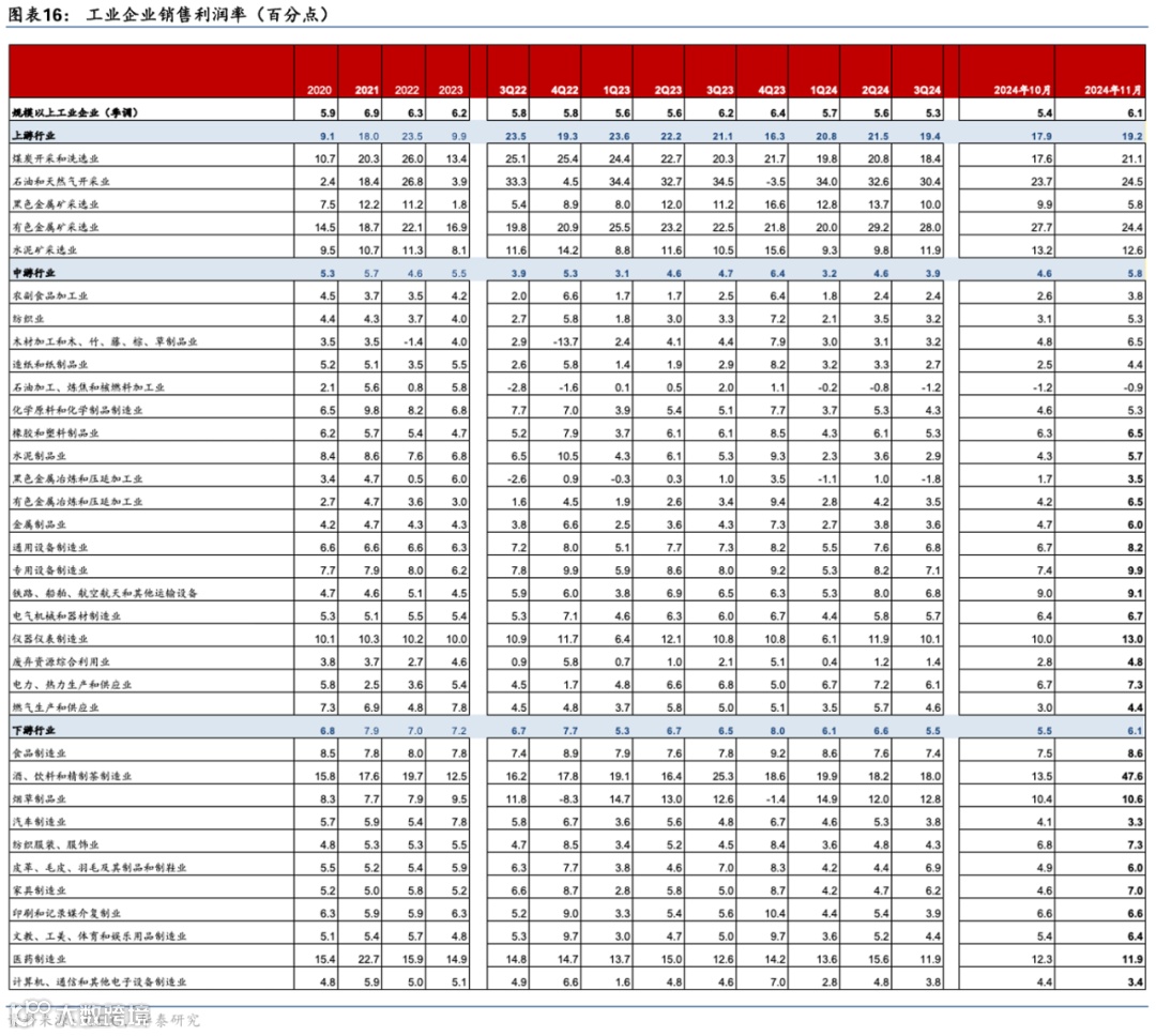 11月工业企业利润率(季调后)较10月的5.4%回升至6.1%,拆分看,10月上中下游利润率(季调后)均有所上行——上/中/下游行业工业企业利润率较10月的15.9%/4.3%/6.6%上行至18.1%/5.2%/6.7%,但上游利润率仍显著高于中下游、利润率分化仍呈现较为明显的分化趋势(图表4-7)。具体分行业看,上游行业中,有色、黑色和水泥采选利润率回落0.7~4.1个百分点,而煤炭/石油采选利润率分别较10月回升3.5/0.8个百分点。中游制造业利润率亦整体上行,如纺织、有色加工、专用设备和仪器仪表等制造业行业利润率回升2.2~3.1个百分点。下游行业利润率表现分化,烟草、食品和纺织服装等制造业行业较10月回升0.2-1.1个百分点,饮料酒茶利润率较10月大幅上行34.1个百分点,而汽车、医药和电子设备利润率环比回撤0.8/0.4/1个百分点,下游制造业利润率持续改善仍有待内需回升动能企稳(图表16)。