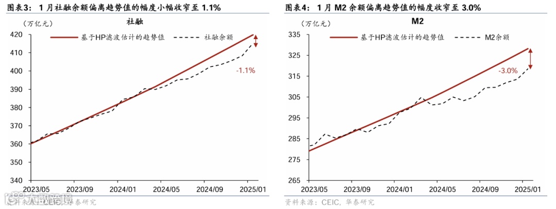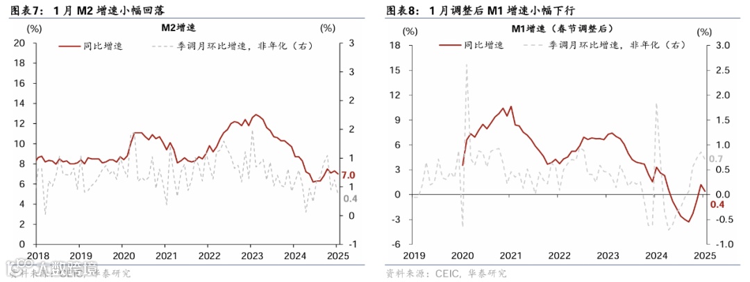 M2同比增速从12月的7.3%回落至7%,主要受企业与非银机构存款同比少增拖累,而开年财政发力对M2形成边际支撑具体看,1月M2同比增速较12月的7.3%回落至7%(彭博一致预期7.3%),经季节性调整后,1月M2月环比(非年化)增速亦较12月的0.6%边际下行至0.4%(图表7)。因此,1月M2余额偏离趋势值3%,偏离程度较12月的3.7%收窄。1月人民币存款余额环比增加4.32万亿元,同比少增1.16万亿元,主要由企业、非银存款分别同比多减1.35、1.66万亿元拖累,而居民存款同比大幅多增2.99万亿元。另一方面,12月财政存款余额环比小幅回升3,324亿元,同比少增5,280亿元,由此财政存款同比增速从12月的-3.7%进一步回落至-11.1%,提振M2同比增速约0.2个百分点。此外,M2同比增速可能也受到春节错位的扰动。