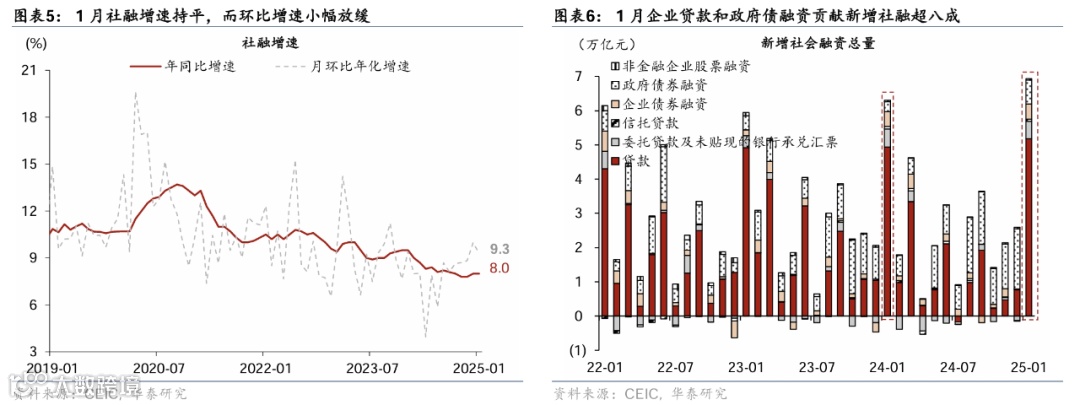 1月新增人民币贷款5.13万亿元,高于彭博一致预期4.53万亿元,同比多增2,100亿元;1月新增社融7.06万亿元,同比多增5,833亿元,且高于彭博一致预期的6.5万亿元。由此,1月社融同比增速持平于8.0%,而季调后月环比折年增速从12月的10.0%小幅放缓至9.3%。从社融分项看,1月企业贷款和政府债融资贡献新增社融超8成,且两项合计同比多增8,286亿元,对应除企业贷款和政府债以外的其他分项合计同比少增2,453亿元。此外,1月新发放企业贷款加权平均利率/个人住房贷款利率环比回落3/1个基点至3.4%/3.1%,低于去年同期40/80个基点
