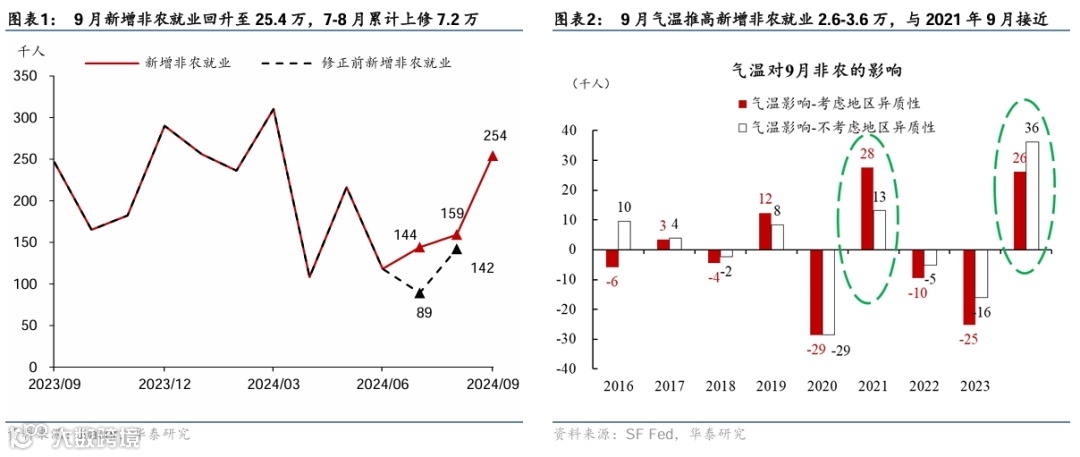 9月美国新增非农就业数据超预期回升,美元走强,降息预期再度下调。10月4日公布的9月新增非农就业大幅回升至25.4万,显著超过彭博一致预期的15万,7-8月累计上修7.2万(图表1);失业率回落0.1pct至4.1%,好于预期的4.2%(参见《9月非农强增长降低联储超预期宽松必要性》,2024/10/5)。9月新增非农就业数据比预期值高了10万以上,且7-8月就业数据还出现累计7.2万的上修,与7-8月非农就业数据明显回落,且下修以往就业数据的走势出现明显背离。一方面,金融市场出现明显波动。非农就业数据公布当天2年和10年期美债收益率上行10bp以上,市场几乎排除11月会议降息50bp的可能性。另一方面,对美国就业数据的质疑也有所增加,包括季调因子推高就业等。我们认为,气温或小幅推高9月非农就业数据,但即使剔除气温影响,9月较为强劲的非农就业数据仍然 “有迹可循”,与美国其他数据的走势保持一致,显示美国经济仍然有韧性,距离衰退仍然有距离。