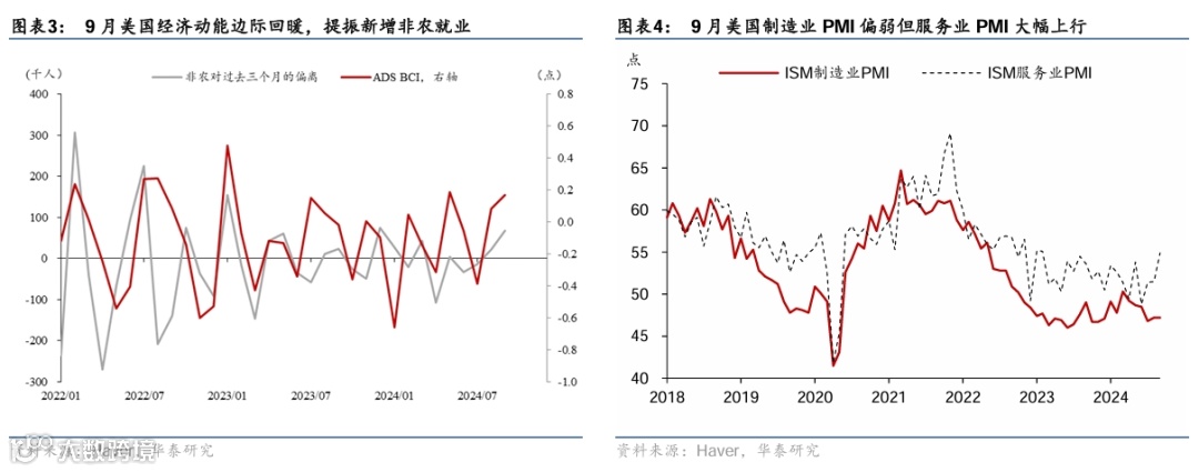9月美国经济动能边际回暖,提振新增非农就业。9月以来美国增长动能整体改善,提振新增非农就业。例如ADS经济周期指数在9月持续回升,指示9月新增非农将高于过去三个月的趋势(图表3)。9月美国ISM制造业PMI虽然维持在47.2,低于彭博一致预期的47.5,整体仍然偏弱,但9月ISM服务业PMI大幅上行3.4pct至54.9,高于预期的51.7(图表4)。