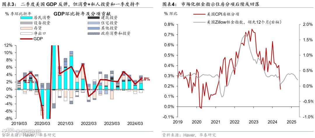 近期增长层面,二季度美国增长仍有支撑但整体减速,对降息的制约下降。7月美国Markit综合PMI超预期回升至55.0、二季度GDP季比折年增速从1.4%回升至2.8%,显示美国经济仍有支撑,但与去年下半年均值(4.1%)相比,美国经济动能仍延续减速趋势。就业市场的放缓更为显著,二季度新增非农就业平均为17.7万/月,相对一季度的26.7万/月明显放缓;联储关注的岗位空缺和失业人数之比已接近疫情前水平,并且高频数据指示岗位空缺或进一步回落;失业率的三个月移动平均较12个月内的低点回升约0.43pp,接近萨姆定律0.5%的警戒线。