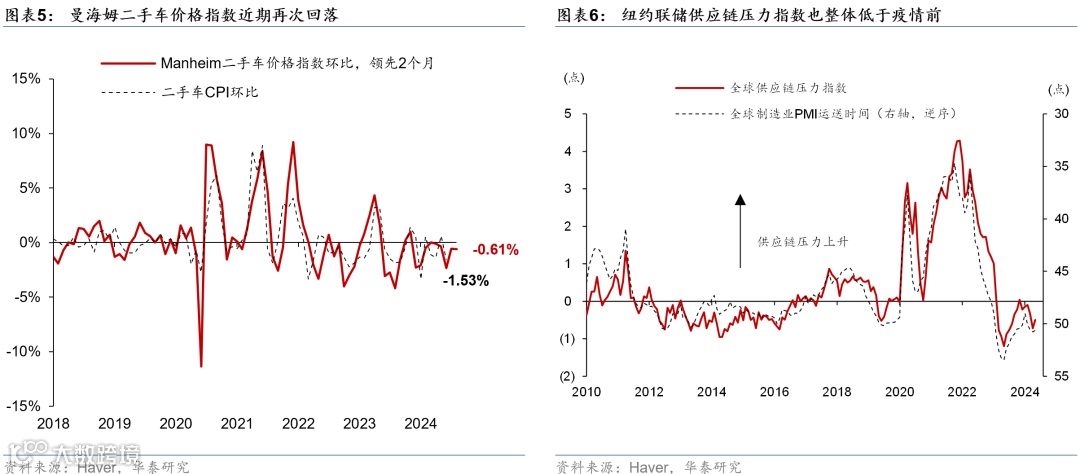通胀层面,二季度通胀显著放缓或是影响联储降息最大的驱动因素。5-6月CPI均显著低于预期,6月核心CPI环比回落至0.1%,为2021年1月以来新低:此前粘性较强的住房通胀显著放缓,6月环比为0.17%,显著低于1-5月的0.45%;其他核心服务也同样走弱,6月环比均值为0.07%,低于1-5月的0.46%。往前看,通胀未来或延续偏弱态势,降低联储对通胀偏高的担忧。Zillow等新签租金指数指示住房分项仍将偏弱;离职率显示工资压力仍在下降,住房外其他核心服务明显回升可能性较小;曼海姆二手车价格指数以及纽约联储供应链压力指数相对偏弱,显示核心商品通胀目前没有明显的上行压力。