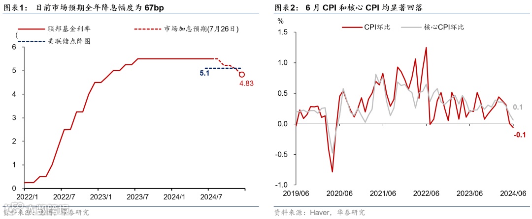 6月会议以来,美国通胀数据超预期回落,增长有支撑但整体放缓,市场降息预期升温;预计7月FOMC整体符合市场预期,但由于近期通胀下行超预期,且市场形成9月降息共识后,短期波动加大、金融条件有所收紧,不排除联储为降息预热,力图一定程度上平复市场波动。目前市场降息预期明显升温,9月首次降息的概率为100%,全年累计降息概率从6月议息会议后的40bp左右升至67bp(图表1)。