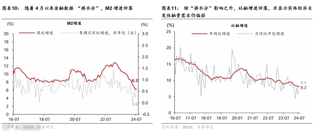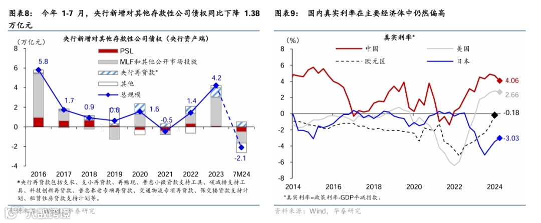 2.货币政策:进一步降息、降准的窗口开启,同时,亟需加大地产逆周期调节的力度(包括降低存量房贷利率等),并加大基础货币投放、支撑货币扩张。无论是从基础货币扩张速度、还是真实利率(资金成本)方面衡量,今年2季度后货币政策均呈边际紧缩走势。今年1-7月,央行新增对其他存款性公司债权、即外汇储备以外的主要基础货币组成部分,同比下降1.38万亿元,其中MLF、PSL存量均明显收缩,然而,央行其他资产亦未能有效扩张。某种程度上,基础货币的走势显示,多重货币政策目标在执行过程中、可能带来阶段性的紧缩效应(图表8)。货币“价格”层面,实际利率仍然明显偏高——如以1年期LPR报价减去GDP平减指数同比衡量的国内真实利率,导致实体经济自发的融资需求偏弱(图表9)。同时,叠加4月以来金融“挤水分”的技术性扰动,M2和社融增速有所回落(图表10-11)。下半年,挤水分和叫停手工补息的影响逐渐消退,而配合财政发力,央行继续加大基础货币投放、进一步降低资金成本,以支持周期企稳回升。