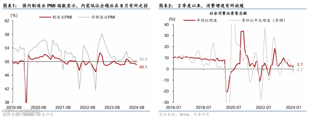 随着暑期结束,年中预算调整窗口的到来,政策宽松预期升温。不排除在对上半年经济走势进行评估后、政策可能迎来宽松窗口期。今年5月后,内需增长走弱,近期,外需增长也出现放缓迹象。5-7月,国内制造业PMI指数从4月50.4%的扩张区间回落至49.5%,而8月则进一步回落至49.1%,显示内需企稳后有所走弱(图表1)。需求端,2季度以来消费增速有所放缓,社会消费品零售总额同比增速从1季度的4.7%降至2季度的2.6%,7月小幅回升至2.7%,但高频数据显示,8月增速可能再度回落(图表2)。值得一提的是,2023年占最终消费支出3成的政府消费近期有所减速,今年3-6月包括一般公共预算+政府性基金在内的广义财政支出同比下降5.2%。同时,地产需求仍在探底——虽然4月后基数下行,但地产销售、投资、开工、土地交易等各项指标同比增长仍收缩,且环比仍在负增长区间。外需也面临不确定性,5月后全球制造业补库周期放缓,而经济增长也边际降温(参见《联储期待的增长放缓趋势出现了吗?》,2024/5/20)。在对上半年经济形势进行评估后,7月政治局会议提出要“坚定不移地完成全年经济社会发展目标任务”,并表示宏观政策要“持续用力、更加给力”。近期内需走弱以及海外增长减速,可能会加速稳增长政策的出台。