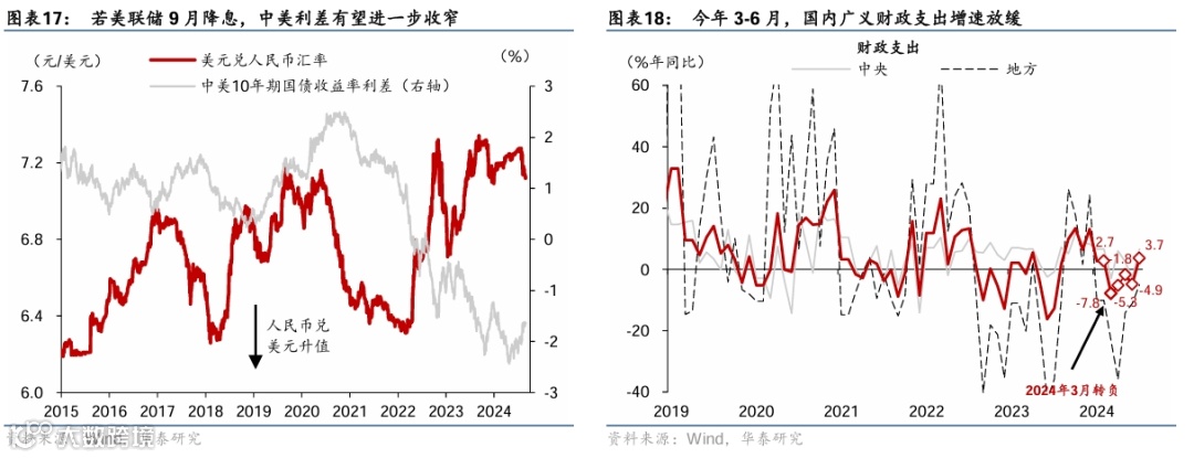 4.海内外需求共振下行,扩内需紧迫性和政策空间均明显上升。美联储坚定“转鸽”为国内货币政策调整打开更大空间。全球制造业周期在6月开始回落,而7月全球制造业PMI再度陷入收缩区间,预计8月可能进一步回落(图表15)。美国方面,随着经济增长放缓,“衰退焦虑”升温,联储在8月的Jackson Hole年会上已经明确表示即将开启降息周期。同时,联储主席宣布,联储的政策重心已经坚决地从“去通胀”转向“稳增长”——也就是说,“Fed Put”再次生效,如果美国经济增长和劳工市场进一步降温,则联储的降息频率和“步长”也均会随之加大(参见《联储主席年会讲话:降息之迫切溢于言表》,2024/8/24)。美国经济的减速加大了中国逆周期调节的紧迫性;而联储坚决地“转向”,也意味着中美短端利差可能明显收窄,持有人民币的“机会成本”有望明显下行(图表17)。人民币汇率波动压力减轻(参见《从近期人民币走强说开去》,2024/8/30),边际支撑资本回流。同时,联储如果快速降息,全球、包括中国央行在内的降息空间也将更大。基准情形下,我们预测美联储将在今年9-12月间降息三次,而如果美国经济数据出现任何进一步减速的迹象,不排除联储可能在年内降息100个基点、甚至更多。由此,央行下调利率的空间和动力都将明显上升。——如果联储年内降息3-4次,75-100个基点,我国央行可能进一步下调LPR 30-40个基点。