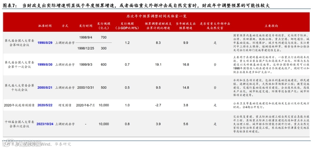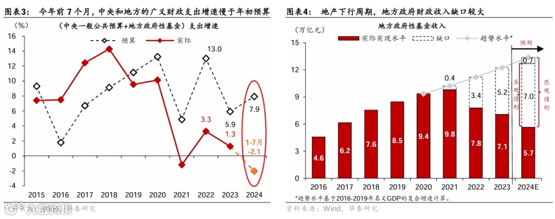 1.财政政策:9-10月迎来年中调整预算的“窗口期”——财政支出增长亟待提速,地方化债的推进可能更趋稳妥。今年1-7月中央+地方财政支出同比下降2.1%,明显低于年度预算中+7.9% 的同比增长——支出进度滞后预算约10个百分点。考虑到年度财政总支出预算为28万亿元,目前年化支出进度滞后近3万亿人民币(图表3)。支出大幅不及预算,主要受财政收入增长偏弱制约、尤其是地方政府收入下行的拖累较为明显——图表5和6显示,今年地方和中央的财政收入年初至今均同比收缩,且距离年初预算有较大距离。目前,中央+地方财政支出增速明显低于名义GDP增长,显示财政政策实质执行层面呈紧缩态势,与年初人大预算和4月、7月政治局会议阐述的财政政策立场有所背离,所以,亟需补充预算赤字来支撑财政扩张。从历次年中预算调整的经验看,当财政支出实际增速明显低于年度预算增速,或者面临重大外部冲击或自然灾害时,财政年中调整预算的可能性较大,调整时间主要集中在8月底至10月间——潜在的调整幅度应在1万亿起(图表7)。