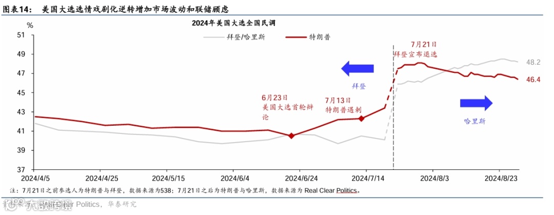 3.外交政策:随着美国大选进入最后的冲刺期,以及今年11月G20和APEC峰会召开在即,中国和美国以及其他主要国家间的交流、沟通可能更加密集。6月底以来,美国大选选情“峰回路转”,目前,民主党候选人哈里斯在摇摆州民调中开始领先(参见《民主党代表大会:更新版经济政策现雏形》,2024/8/20)。如果当选,哈里斯将很大程度上“继承”目前拜登的政治主张和政府内阁成员,包括中国在内的全球政府会就这一变化做出相应的调整(图表14)。诚然,过去两个月的经历表明,美国大选在最后两个月的冲刺阶段仍可能出现变数,然而,无论选举结果如何,中国、乃至全球各国都需要为迎接新一届美国总统和议会做积极的准备,以求两国关系在美国新政府“接棒”之际完成平稳的过渡,并争取良好的开局。8月27日至29日,美国总统国家安全事务助理杰克·沙利文访问中国,中美双方举行新一轮战略沟通。会后白宫方面表示,中美元首或将在未来几周内举行通话,同时,不排除两国元首在今年11月的G20峰会和APEC会议上举行会晤。这一系列的积极举措显示,两国政府均希望在大选年更为积极地管理中美关系。中美关系趋稳、甚至边际缓和,均有利于稳定海内外投资预期。值得一提的是,叠加近期美国加息预期快速升温,人民币明显走强——这些积极的变化均为国内政策调整、尤其是货币政策宽松打开更大的空间(参见《从近期人民币走强说开去》,2024/8/30)。