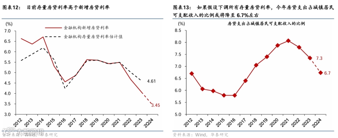 存量房贷利率(再次)调整可能是题中之义,降低居民还贷现金流负担,有助于缓解房贷需求下行压力,并边际提振居民购买力。2022年以来,随着新增房贷利率快速下调,而存量房贷利率调整滞后,存量房贷利率明显高于新增房贷利率。我们估计,2023年存量房贷利率在4.6%左右,而到今年2季度,新增房贷利率降至3.45%的低位(图表12)。如果假设所有存量房贷的利率均下调至今年2季度新增房贷利率的水平,基于2023年底38.2万亿元的房贷余额来测算,存量房贷“转融资(re-financing)”每年将降低房贷支出2,500-3,000亿元,占2023年居民房贷支出的7-8%,占2023年城镇居民可支配收入、以及社会消费品零售总额的比例均为0.5-0.6%,而今年房贷支出占城镇居民可支配收入的比例将从去年的7.3%降至6.7%(图表13)。