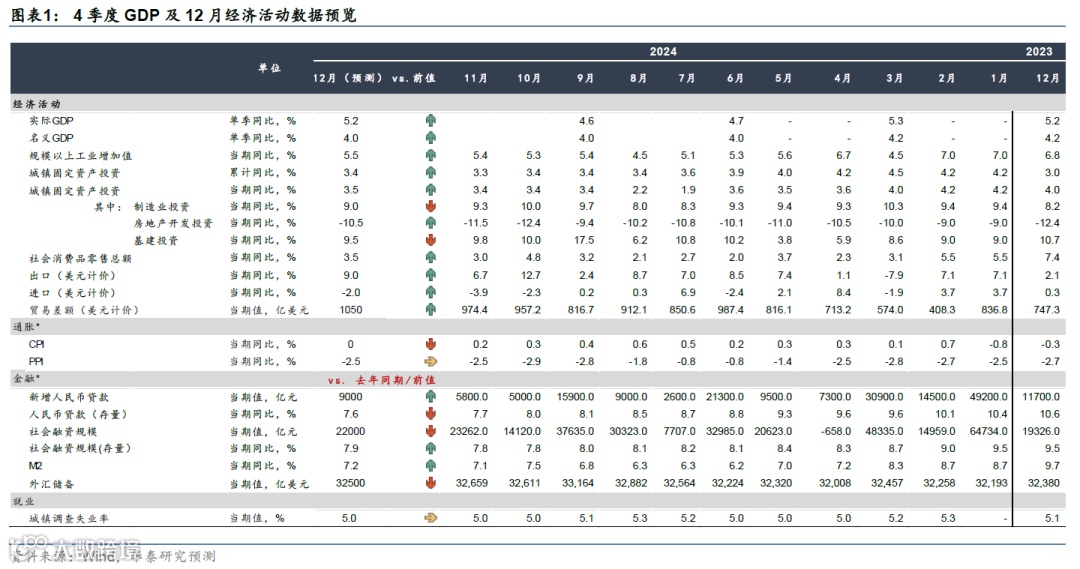概览:4季度基数升高、但9月以来的稳增长政策带动消费、地产及工业生产回升,关税预期下“抢出口”效应亦推升年底出口增速,对增长形成支撑,我们预计实际GDP同比或较3季度的4.6%回升至5.2%。12月而言,地产投资降幅延续收窄态势,出口增长也可能再度回升,12月广义财政部门债券净发行同比延续多增,主要由于置换债发行加速推动,显示财政边际扩张,叠加地产需求侧政策生效、地产成交有所改善,或带动新增社融同比多增。