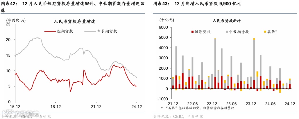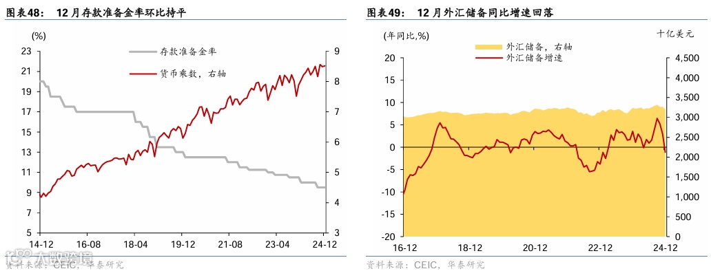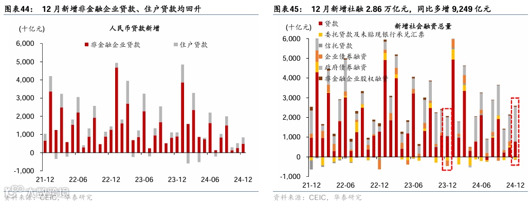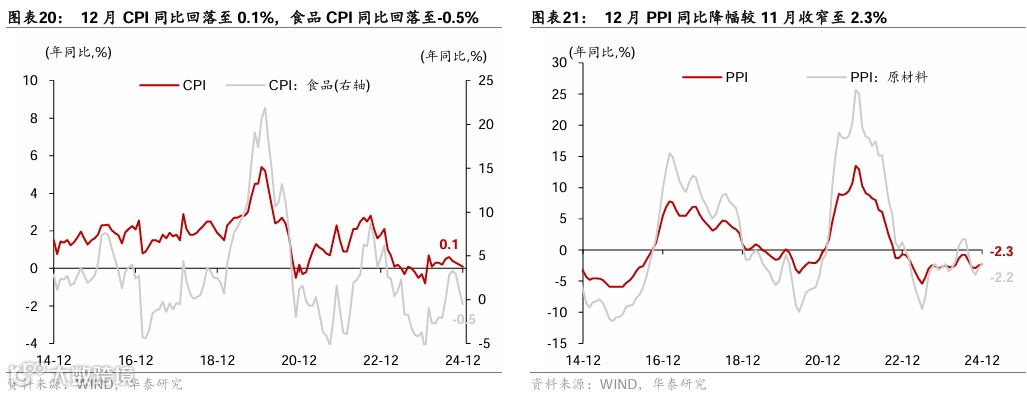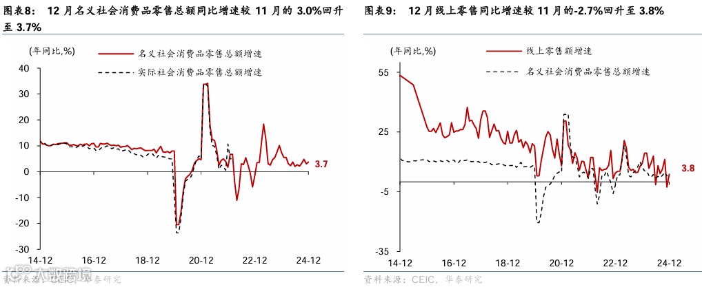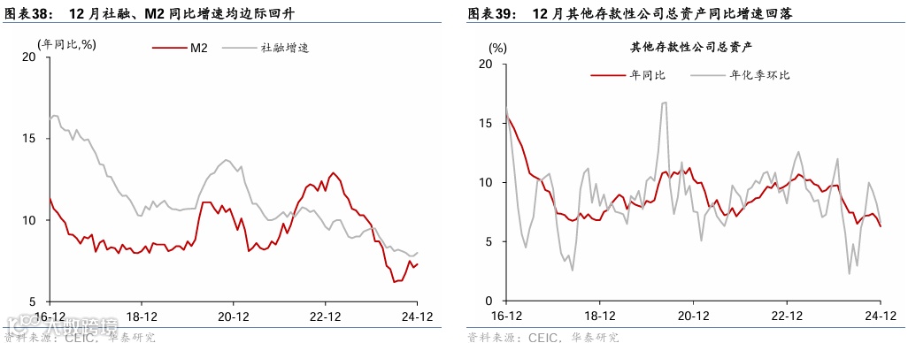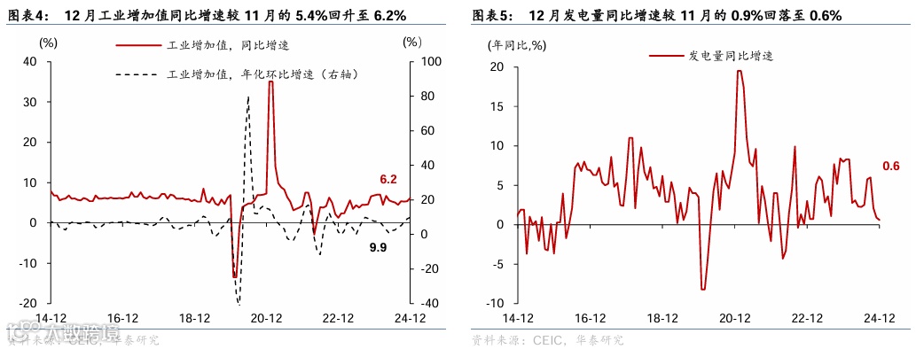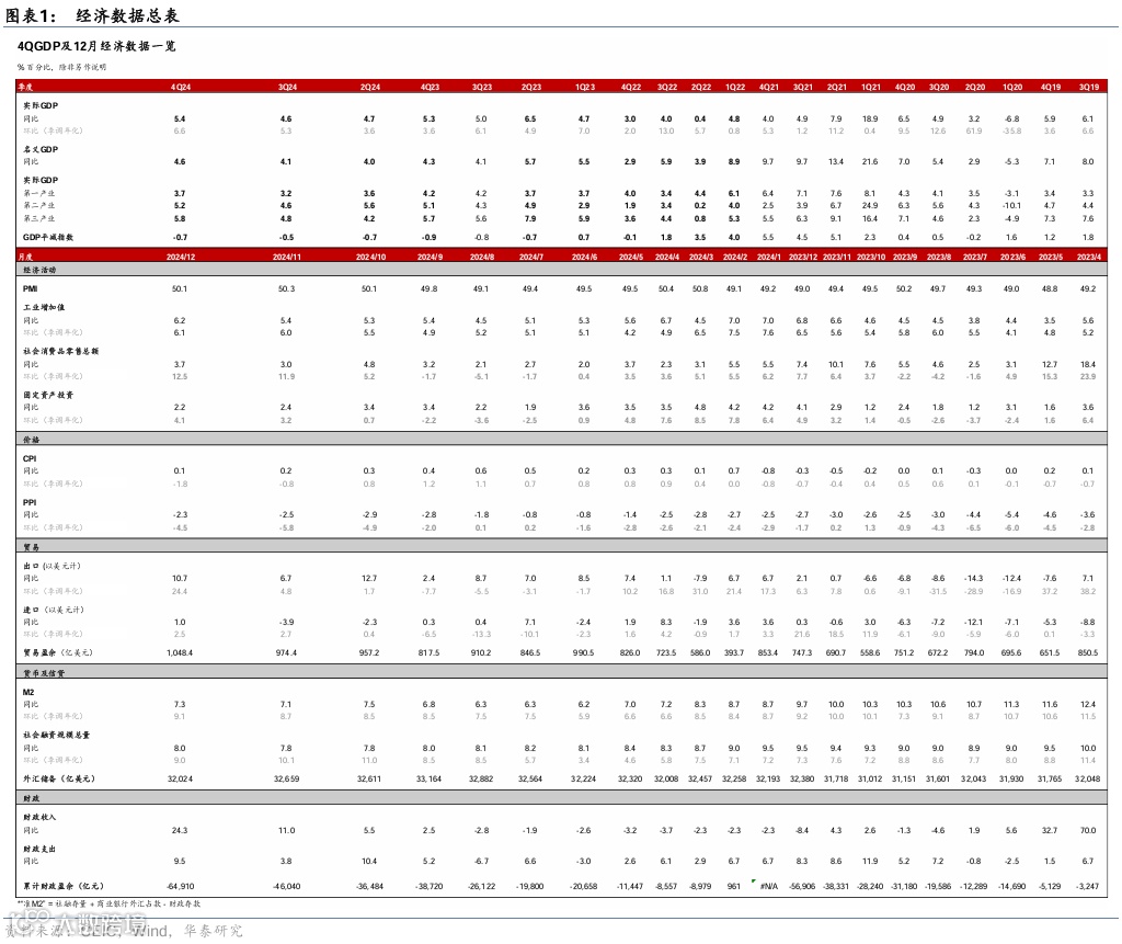 4季度GDP及12月重要宏观数据回顾:1)2024年全年GDP同比增长5%,名义增速4.2%;4季度GDP当季实际/名义同比回升至5.4%/4.7%;2)12月工业生产走强,购物节错位效应消退后社零增速“正常化”:12月工业增加值/社零同比增速上行至6.2%/3.7%、而固定资产投资同比增速回落至2.2%。3)12月美元计价出口/进口同比增速回升至10.7%/1%。4)12月中国CPI同比较11月的0.2%回落至0.1%,PPI同比降幅较11月的2.5%收窄至2.3%。5)12月M1同比降幅从11月的3.7%再度收窄至1.4%,M2同比增速较11月的7.1%回升至7.3%,主要受财政存款同比少增提振。