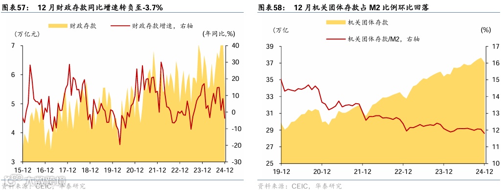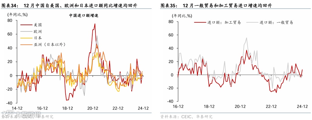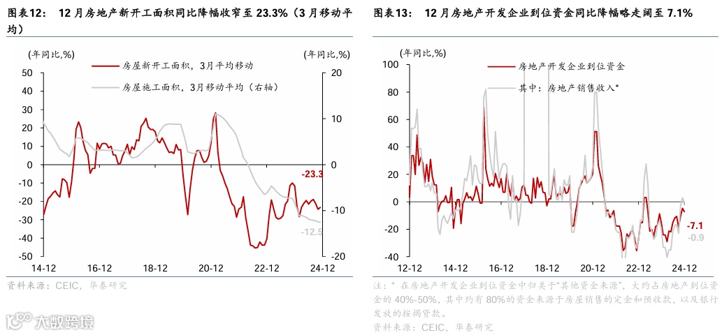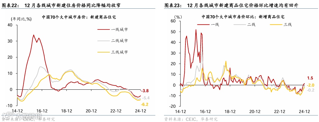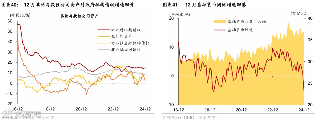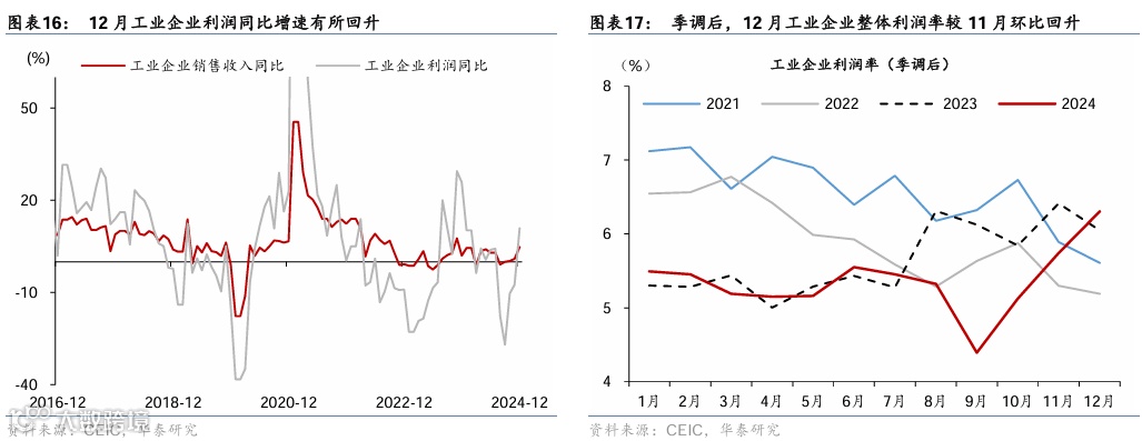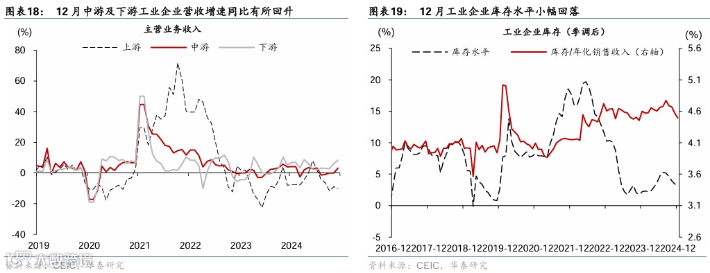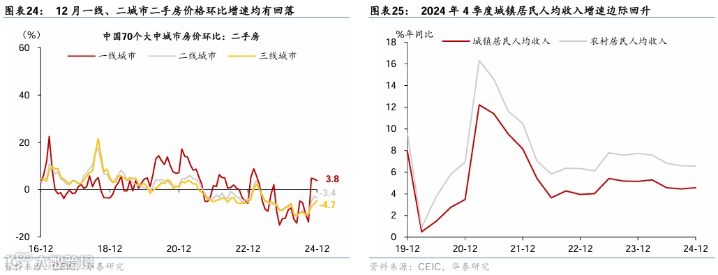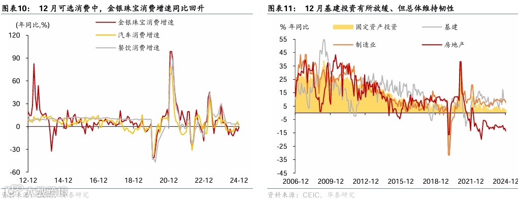 4季度GDP及12月重要宏观数据回顾:1)2024年全年GDP同比增长5%,名义增速4.2%;4季度GDP当季实际/名义同比回升至5.4%/4.7%;2)12月工业生产走强,购物节错位效应消退后社零增速“正常化”:12月工业增加值/社零同比增速上行至6.2%/3.7%、而固定资产投资同比增速回落至2.2%。3)12月美元计价出口/进口同比增速回升至10.7%/1%。4)12月中国CPI同比较11月的0.2%回落至0.1%,PPI同比降幅较11月的2.5%收窄至2.3%。5)12月M1同比降幅从11月的3.7%再度收窄至1.4%,M2同比增速较11月的7.1%回升至7.3%,主要受财政存款同比少增提振。