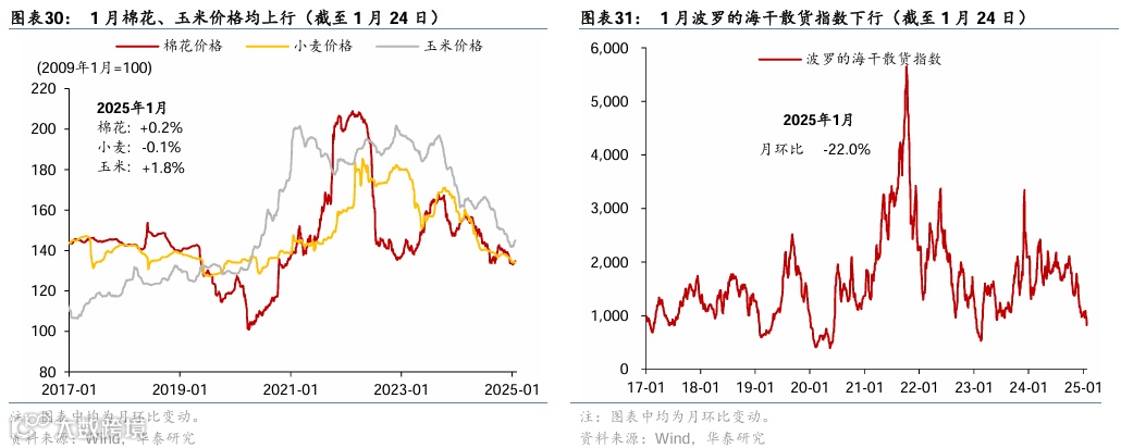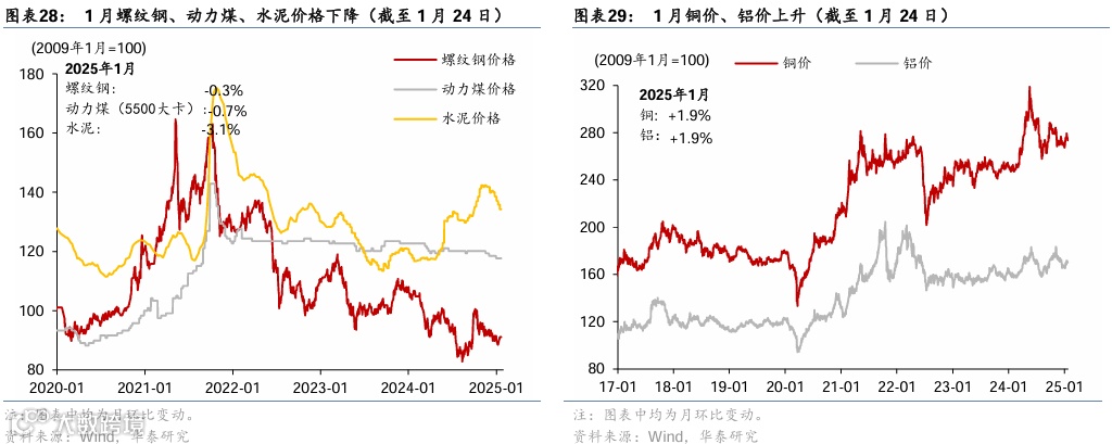 通胀:国际油价、金价均走高,临近春节农产品价格整体回暖。截至1月24日,布伦特油价全月环比回升6.7%至78.5美元/桶;COMEX黄金月环比回升5.5%至2777美元/盎司;国内原材料铜/铝价均环比回升1.9%,螺纹钢/动力煤/水泥价格环比回落0.3%/0.7%/3.1%。农产品价格总体回升,其中猪肉/蔬菜/水果价格环比回升3.5%/5.5%/1.9%。