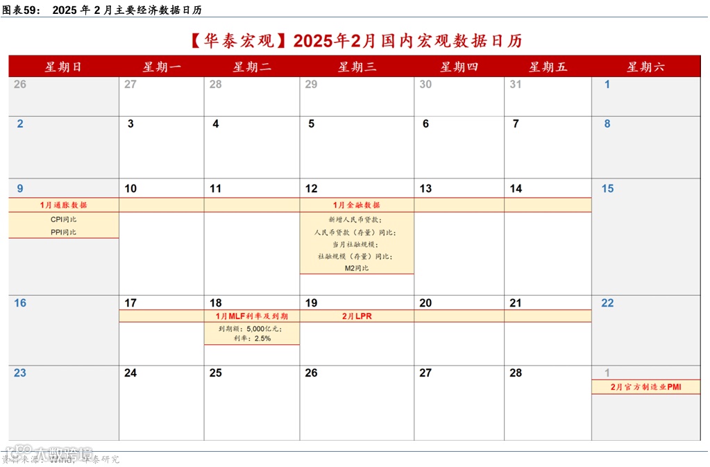 政策及事件:1)全国31个省市均已召开地方两会并公布2025年全年增长目标,地方两会GDP增速目标加权平均值为5.3%,略低于2024年的5.4%。2)1月3日发改委发布会明确2025年“将大幅增加超长期特别国债资金规模”,“两新”设备范围扩容。3)1月17日,国常会研究促进就业有关政策举措,聚焦先进制造、服务消费、民生保障等重点领域,推进实施岗位开发计划。4)1月22日六部门联合印发《关于推动中长期资金入市工作的实施方案》,明确公募基金持有A股流通市值未来三年每年至少增长10%,国有保险公司从2025年起每年新增保费的30%用于投资A股。