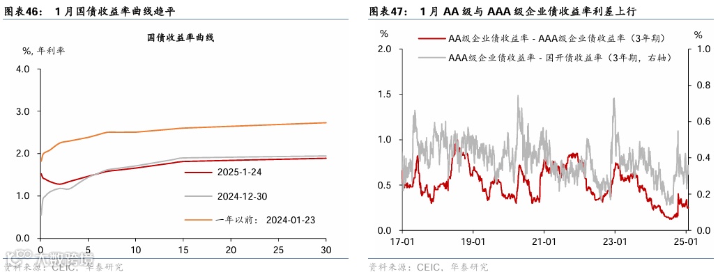金融市场:1月LPR未调降,MLF缩量平价续作2,000亿元;利率债净发行同比多增。国债收益率曲线趋平;银行间流动性偏紧,R007/DR007月环比回升120/55bp。1月国债、地方债和政策性银行债合计净发行1.03万亿元,同比多增6,269亿元。汇率方面,截至1月24日,人民币兑美元汇率回撤0.8%、兑一篮子货币亦小幅回撤0.01%。