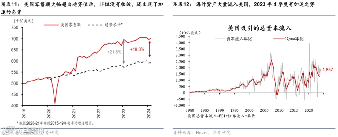 美国实物消费在疫情期间大幅超出趋势水平,但由于居民可支配收入和净资产继续超趋势增长,美国实物消费与趋势水平之间、接近20% 的差值非但不收敛,近期还出现了边际再度扩张的趋势(图表11)。
