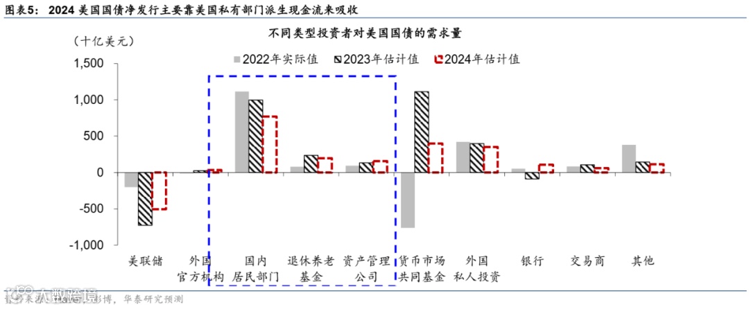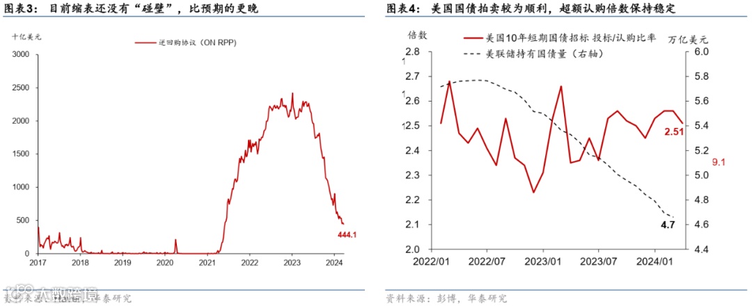 2.不仅如此,在高利率的环境下,市场流动性目前仍然保持较充裕的水平,此前很多人担心的“缩表碰壁” (图表3)、抑或国债拍卖出现困境,至今均尚未发生。图表5显示,2024年,美国国债净发行计划达到1.7万亿美元左右,如果美联储继续以较快的速度缩表、连带美国金融机构也将扩表受阻,那么,美国国债边际购买者将主要是(从各种渠道参与的)本土居民和企业部门,同时,海外机构也可能增加配置。目前,美国国债拍卖较为顺利,超额认购倍数保持稳定(图表4)所以,目前金融体系对高利率的承受能力好于预期,一个较为合理的推测是,美国名义增长和实体经济现金流仍然强劲——1季度名义增长可能接近、甚至超过5%。