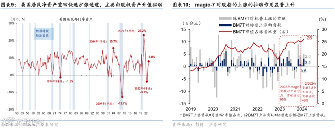 此外,美国居民的净资产增长也在2022年短暂转负后回到快速扩张的轨道,明显提振消费信心。图表9显示,美国家庭净资产在2023年扩张8%。美国家庭金融资产和净资产中,以基金和养老金等形式投资股权资产的份额达到6成左右。AI引领的产业周期,对美国家庭净资产增长的贡献可能更为直观——如图表10所示,magic-7对标普指数的总拉动效应日益上升——2023年,magic-7的亮眼表现推升标普指数达到23个百分点,对指数表现的贡献率达到95%,而2024年1-2月,这一贡献率保持在49%,大幅高于其市值占比(25%)。