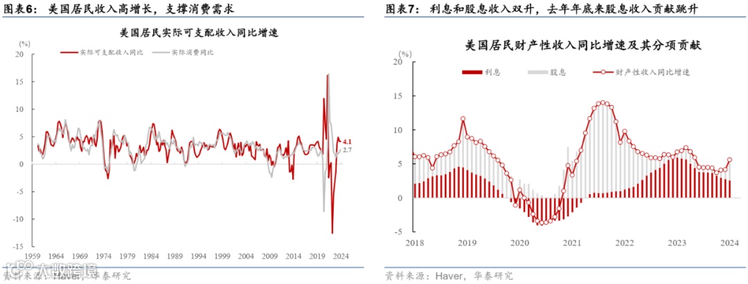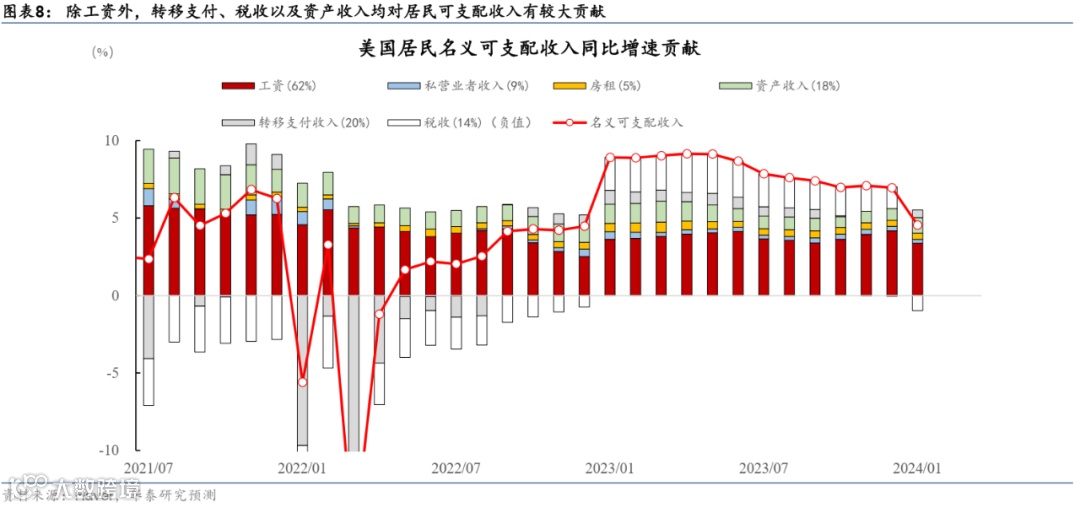 财政宽松仍是居民可支配收入高增长的主要动力,但资本收入的贡献明显上升。尤其值得注意的是,在快加息后,美国出现股息收入和利息收入双驱动的态势,主要受益于股市在快加息周期下的(反常的)强劲表现。2023年,美国居民名义可支配收入的增长达到8.1%,大幅高于2010-19年4%的平均水平。去除通胀的实际可支配收入增长在去年也达到4.1%(图表6),大幅超出历史均值。进一步拆分居民收入的数据,我们看到,工资收入外,转移支付同比上升的增加增厚了2023年居民收入约0.5个百分点,而税收同比下降也提振可支配收入1.7个百分点(图表8)。此外,资产收入也贡献了2023年居民收入增长1.0个百分点,2024年1月,虽然税收的正贡献转负,但资产收入中的股息收入同比大幅跳升5.9%,形成一定的对冲。股息收入和股票市场表现息息相关,也反映了股票市场表现良好。