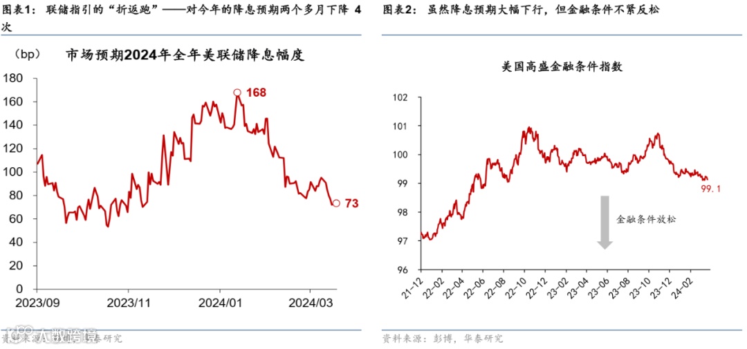 在完成了40年来最快速的一次加息后,美联储从去年11月已经开始为降息“预热”,然而,今年2月来联储有关降息的指引再次带领市场完成了一次“折返跑”——随着数据和联储指引的变化,市场对2024全年降息预期从高点的7次、跌落至目前的3次(图表1)。期间,有一些“耐人寻味”的现象,例如,股市并未出现明显的回调,债市波动率不升反降;与之相连地,金融条件不紧反松,地产需求也未见回落(图表2)。