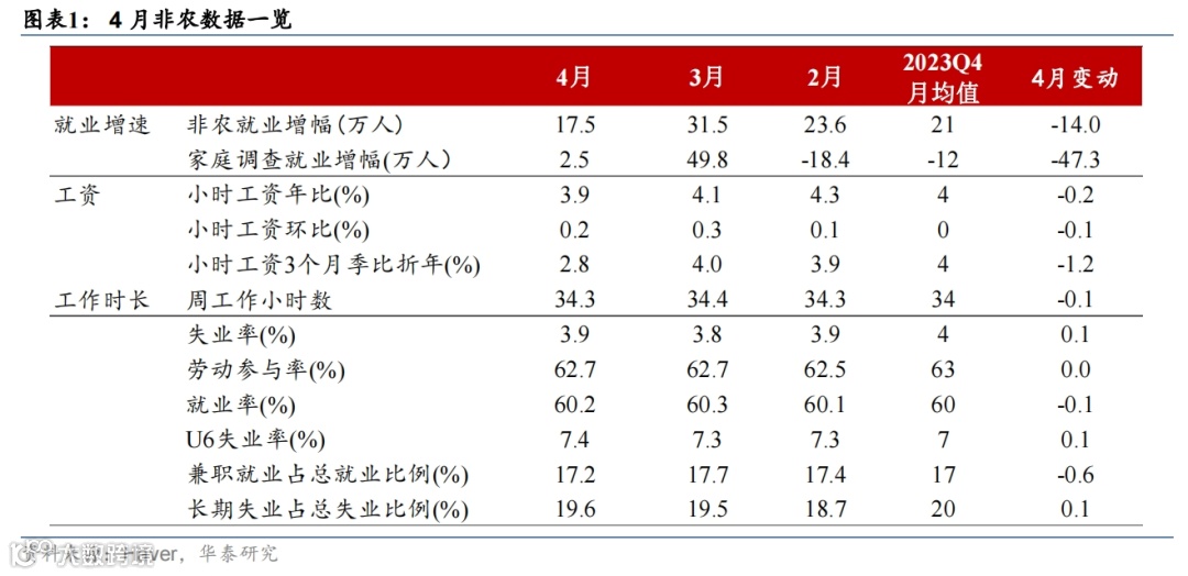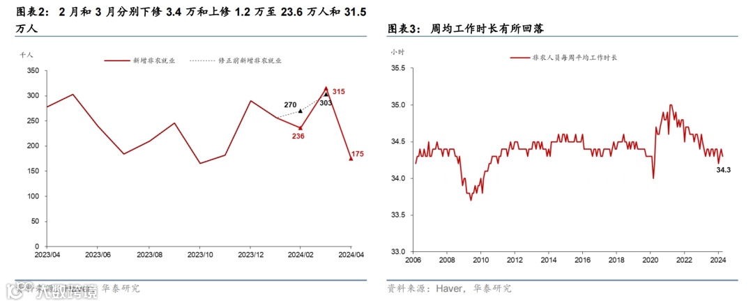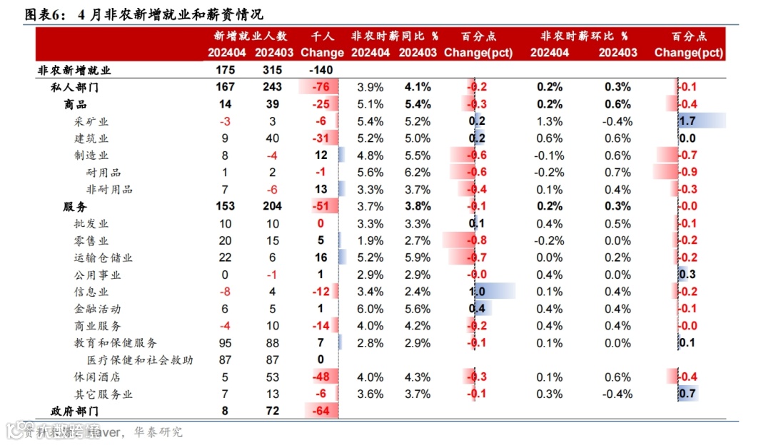 鉴于非农就业回落是联储点名的降息条件之一,4月非农新增就业超预期回落将7月降息概率拉升回50%附近。数据发布后,7月降息概率从37%升至49%,9月降息概率回升至100%,全年累计降息预期回升9bp至50bp,10年期美债利率盘中跌破4.5%。正如我们此前所论述的,人口净流入导致美国新增就业的盈亏平衡水平从10万左右上行至15-18万(《美国:人口流入的宏观影响不容小觑》,2024/4/21),4月新增非农就业低于18万导致失业率上行。往前看,4月非农是2月以来首个显著推升降息概率的数据点。考虑到联储降息意愿较强,5月FOMC整体偏鸽,鲍威尔给出非农明显放缓和/或通胀持续回落的两个降息情形,且未给出加息情形。所以,如果非农走弱趋势延续或通胀重新下行,例如非农就业回落至15万以下、失业率升至4%以上,联储在7月开启降息周期仍有可能性。