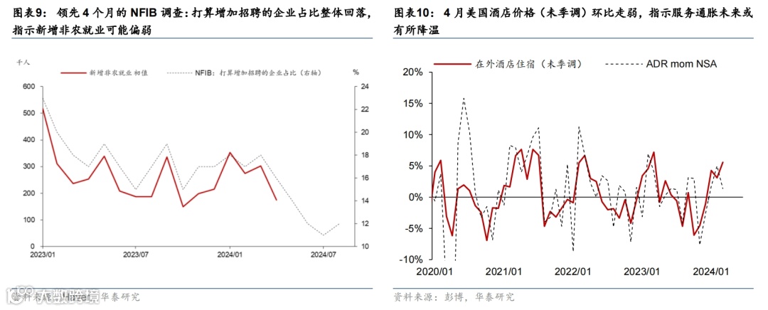 4月非农数据走弱显示劳工市场再平衡仍在持续;往前看,5月非农数据对7月是否可能降息尤为重要,若非农走弱趋势延续或通胀重新下行,且考虑到联储有较强降息意愿,联储7月降息仍有可能。近期劳工市场再平衡有所加速,NFIB小企业雇佣意愿指示非农仍将继续回落(图表9),失业率或逐步回升至4%以上,从而满足鲍威尔给出的非农明显放缓的降息条件。此外,4月小时工资3个月折年增速回落至3%以内,而离职率指示工资将继续回落,有望为当前偏高的服务通胀降温(图表8)。如我们在《联储平息加息疑虑,6月开始削减缩表》(2024/5/2)中所述,市场当前的降息路径可能是“7月开始降息两次”和“不降息”这两种可能性的加权平均,若非农延续走弱态势,且4-5月通胀位于0.3%以下(即年化3%以下),联储7月降息的情形仍可能重回视线。