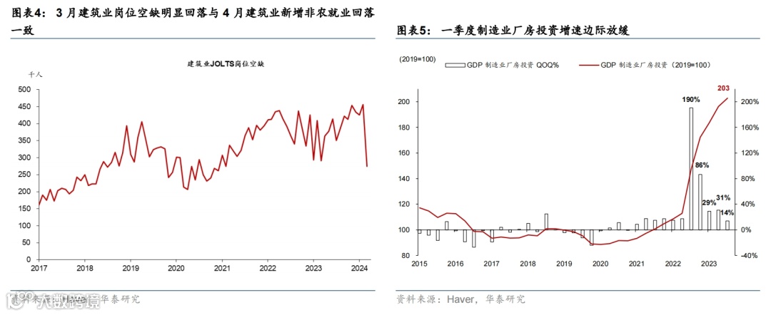 分行业数据显示,4月建筑、休闲酒店、政府等部门新增就业放缓较为明显。商品部门4月新增非农就业1.4万人,较3月回落2.5万人:其中建筑业新增就业放缓幅度较大,较3月下降3.1万至0.9万,这与3月JOLTS调查中建筑业新增岗位空缺大幅回落以及一季度制造业厂房投资边际放缓趋势一致(图表4-图表5)。制造业就业小幅改善,较3月回升1.2万人至0.8万人。服务部门新增就业较3月回落5.1万人至15.3万人,主要来自休闲酒店业拖累(较3月下降4.8万人至0.5万人),显示出行相关通胀或有所降温;其余多数服务业新增就业与3月比变动不大。4月政府部门新增非农就业大幅下降6.4万人至0.8万人,明显低于一季度的均值6.2万人,可能是因为政府扩张力度有所回落。。