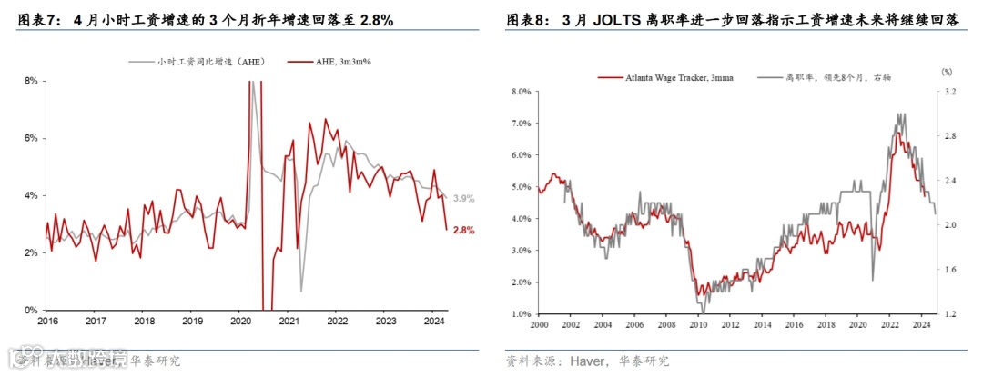 粘性通胀层面,非农数据也显示薪资上涨压力可控——4月小时工资环比增速回落0.1个百分点至0.2%,低于预期,商品和服务部门均回落。4月小时工资的3个月折年增速从3月的4.0%大幅回落至2.8%(图表7)。具体看,商品部门小时工资环比回落0.4pct至0.2%,3个月折年增速从3月的5.3%回落至3.9%,大部分行业工资增速均回落。服务部门小时工资回落0.1pct至0.2%,3个月折年增速回落至2.6%,仅公用事业、教育/保健服务和其他服务业边际回升,其余均回落,其中休闲酒店业薪资“增速”明显下行。