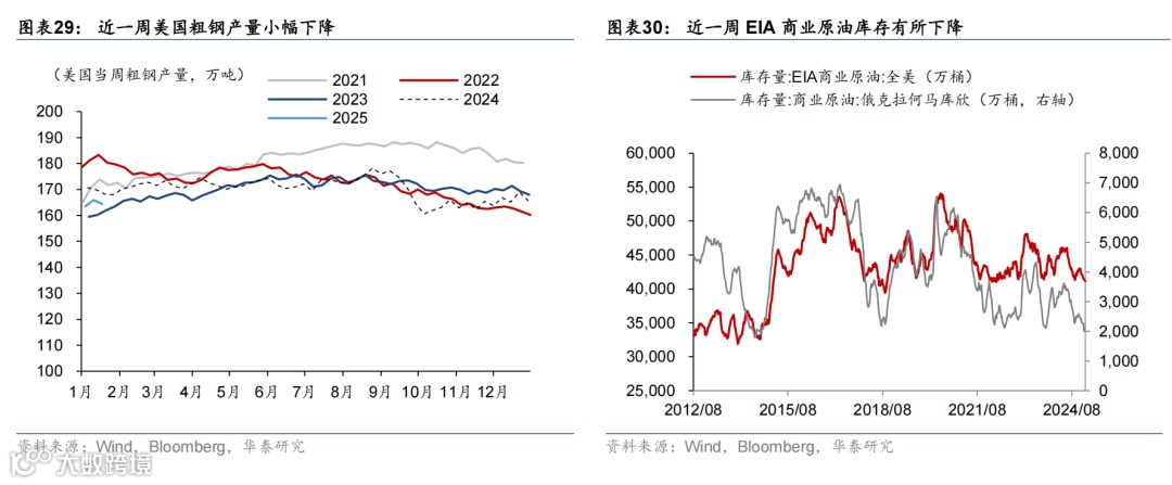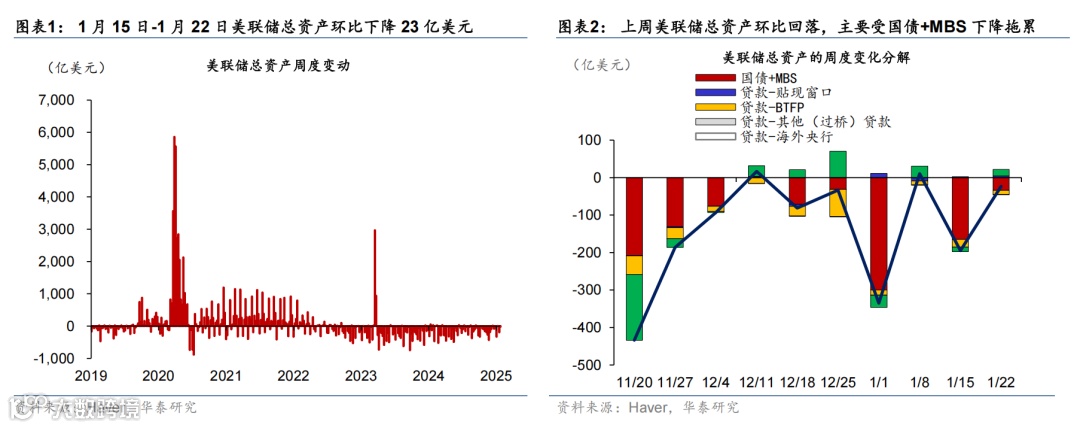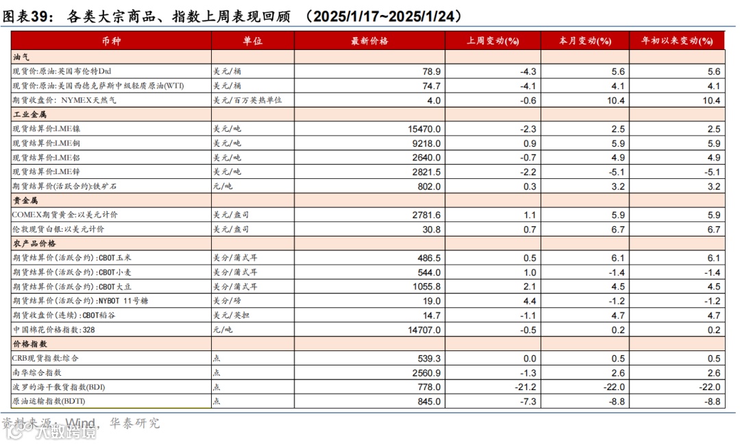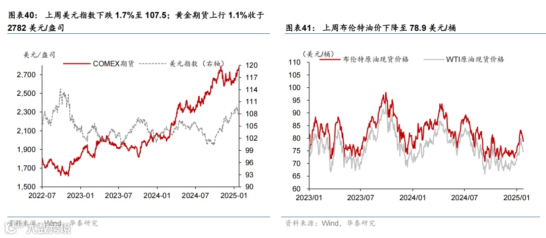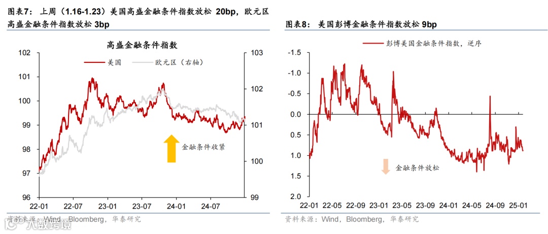 上周特朗普正式就任美国总统,发布近50条行政令,聚焦移民、去监管、行政改革等国内事宜,虽然仍威胁对贸易顺差大国加征关税,但并未在首周落地。美国1月制造业PMI修复超预期,但服务业PMI或受天气因素影响有所回落。日央行如期加息25bp,植田表态偏鹰。市场对联储降息预期回升,美元指数回落,美债收益率基本维持不变,美股上涨,油价回落,金价上行。本周关注FOMC(1月30日)、美国2024年四季度GDP(1月30日)、美国2024年12月PCE通胀(1月31日)。