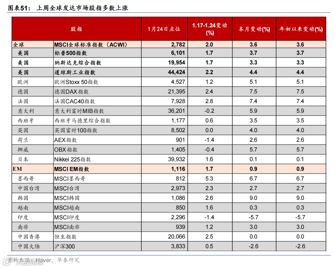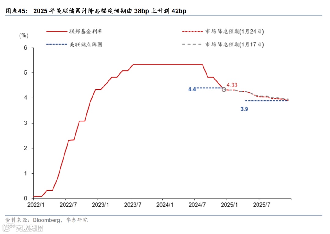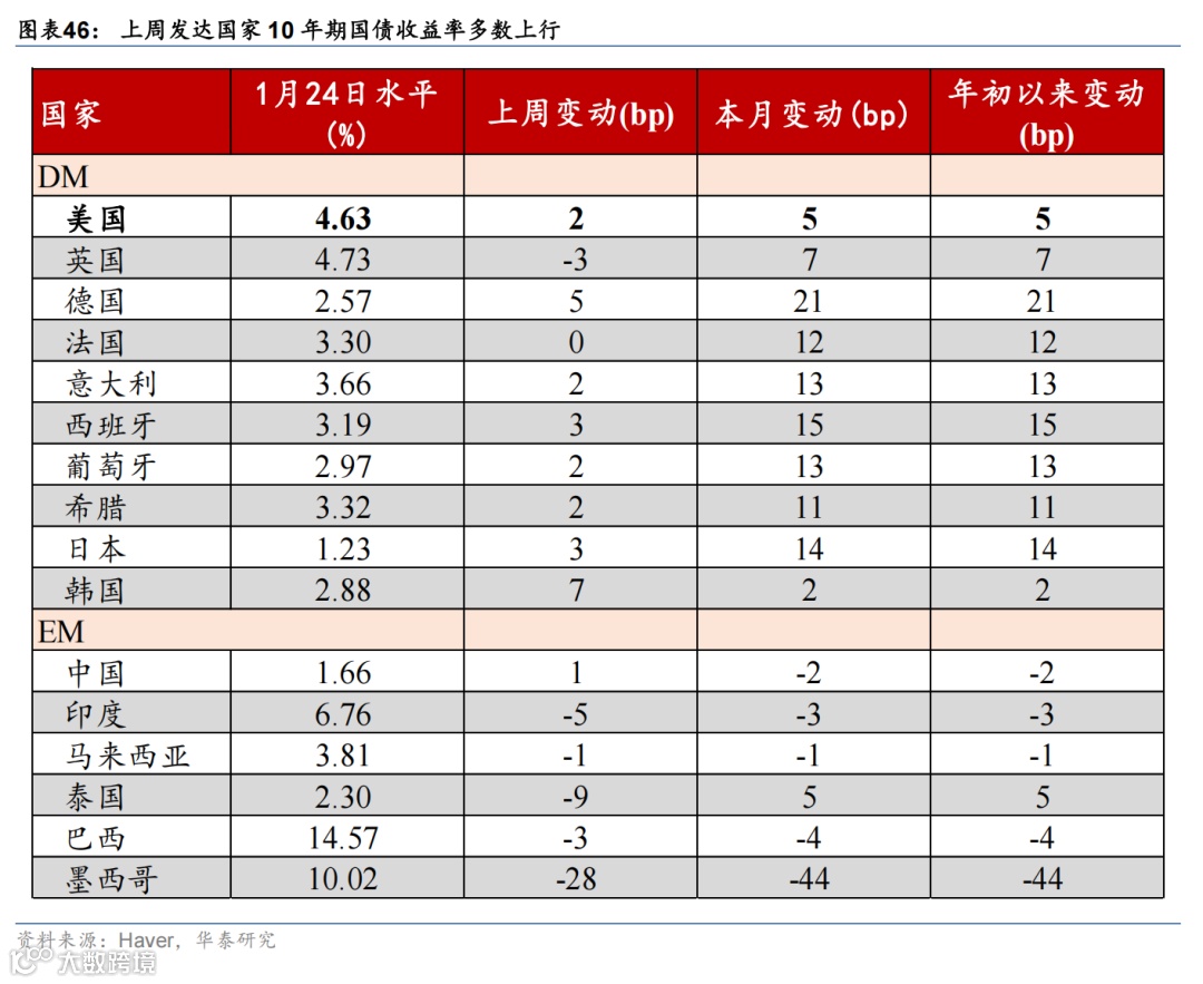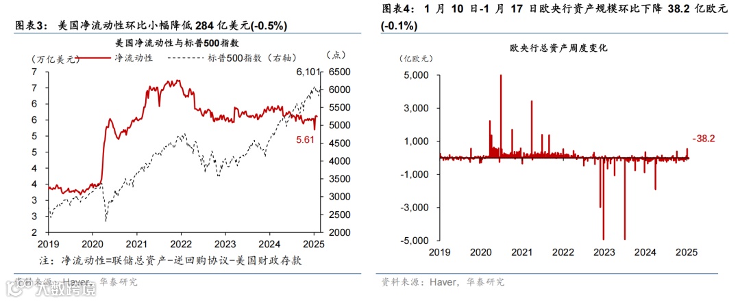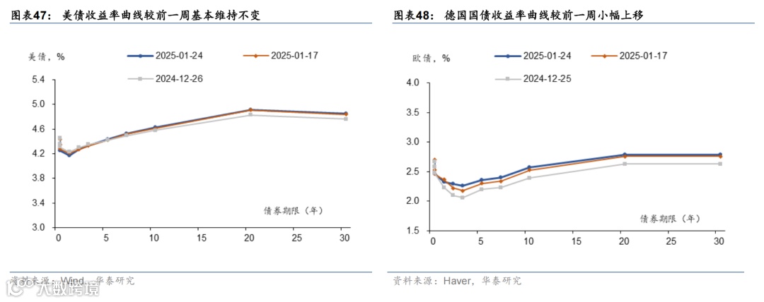 特朗普宣誓就职美国总统,誓言要美国利益优先,为美国开辟“黄金时代”。截至北京时间1月25日,特朗普共计公布49个行政令与备忘录,聚焦收紧非法移民、改革行政管理、去监管、大力推动传统能源开发、促进美国制造业回流、暂停美国对外援助等。值得注意的是,虽然保留对墨西哥、加拿大、中国加征关税的威胁,但特朗普首周并未宣布加征关税,市场对关税的担忧小幅缓解。但关税仍实现制造业回流、对外谈判与补充财政预算的重要工具,未来风险仍不能排除。此外,软银、甲骨文、OpenAI和MGX宣布成立星际之门,未来4年投资5000亿美元用于AI基础设施建设。日央行如期加息25bp,植田和男记者会表态偏鹰。植田和男重申当前日本实际利率为负,政策利率远未达到中性水平,我们预计日央行今年还可能再加息50-75bp。