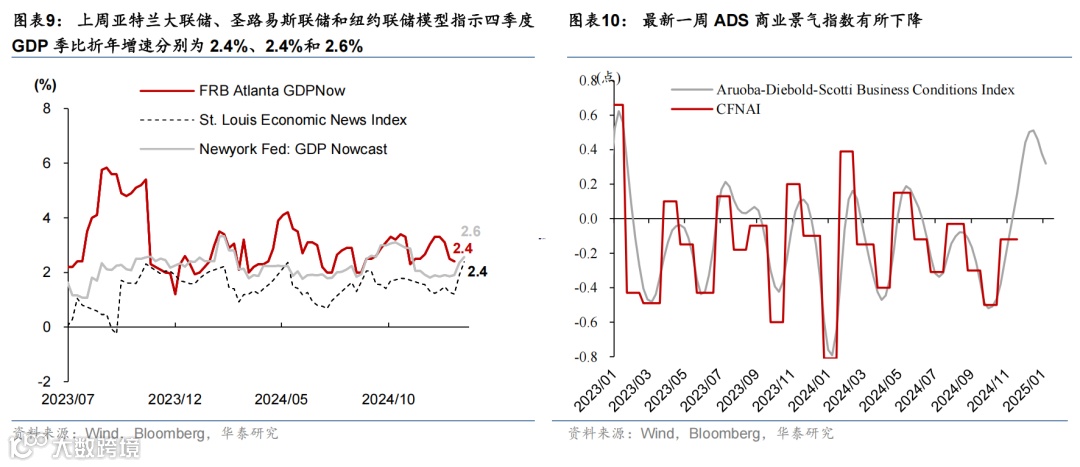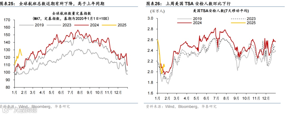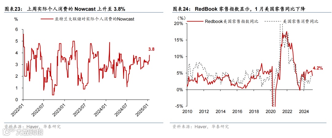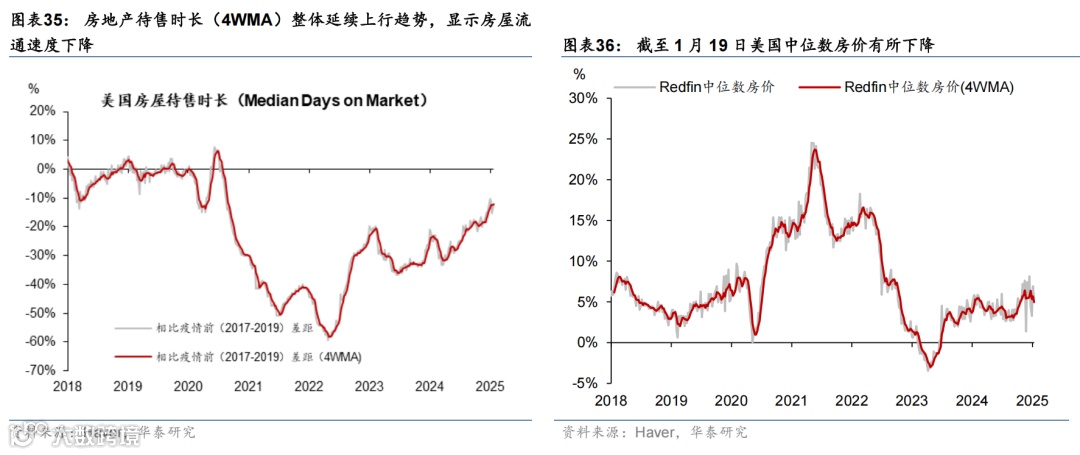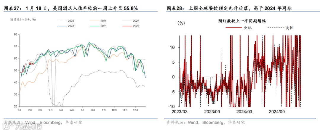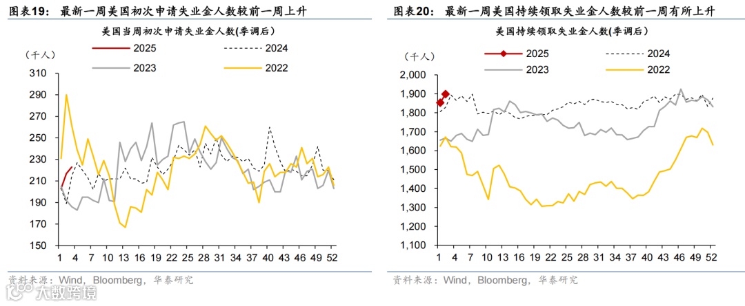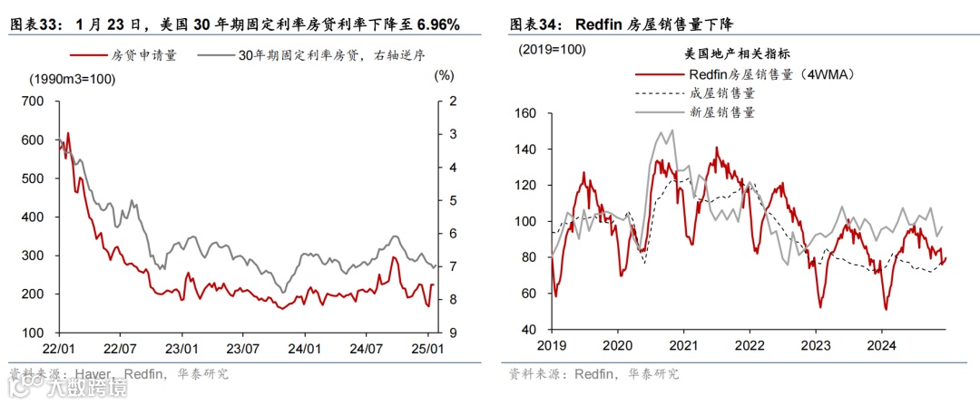 高频数据显示美国消费维持韧性,劳动力市场仍处再平衡进程中,房贷利率维持高位、住房需求持续偏弱。消费方面,上周实际个人消费的Nowcast上升至3.8%,反映美国消费韧性仍偏强。就业市场方面,虽然有加州火灾等因素影响,上周首申人数仅小幅上升0.6万至22.3万人,仍处于疫情以来的相对低位,但续申人数升至190万人,为2021年11月以来的最高水平,失业者找工作的难度上升,表明就业市场仍处于再平衡进程中。地产方面,30年期固定利率房贷利率虽有所下降,但仍处于6.96%的高位,房地产待售时长延续上行趋势、Redfin房屋销量下降,房地产市场仍然承压。