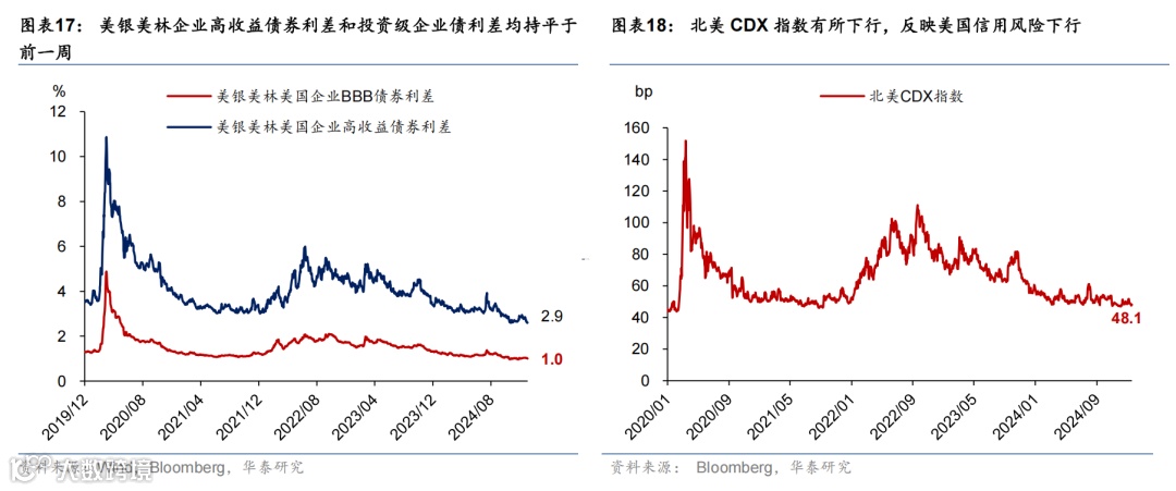 联储降息预期小幅升温,美元下行,美债收益率走势不一,美国三大股指大涨,大宗商品涨跌不一。2025年联储降息预期由38bp升至42bp;2年期美债维持4.27%,10年期美债上升2bp至4.63%;美元指数下行1.7%至107.5;欧元升值1.7%至1.05;日元升0.1%至155.4。美国三大股指均上涨,道指、标普500、纳指分别上涨2.1%、1.7%、1.7%。大宗商品涨跌不一,COMEX黄金期货上涨1.1%至2781.6美元/盎司;布伦特原油期货下降4.3%至78.9美元/桶;LME铜现货上涨0.9%至9218美元/吨。