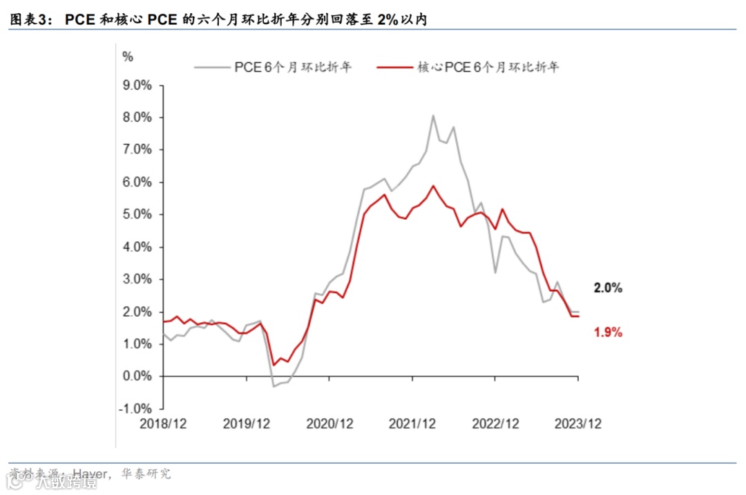 往前看,联储对下一步决策持开放态度,但3月降息的概率下降,5月降息概率上升。过去半年美国核心PCE通胀已经回落至联储目标水平以下(图表3),往前看,若通胀维持偏弱态势,那么联储将开启降息周期,推动利率“正常化”(参见《全球通胀下行速度超预期的宏观含义》,2023/12/17;《联储是否会更快降息,影响几何?》,2024/1/4)。根据鲍威尔的表态,我们认为,基准情形下,联储或5月首次降息,但若3月会前的两份通胀和就业报告明显不及预期,不排除3月降息的可能性。缩表方面,联储3月会议将详细讨论缩表相关问题,我们认为,联储或在年中宣布taper,并分多步骤taper,但以求在不影响金融稳定的前提下实现资产负债表规模“最小化”(参见《减缓缩表:联储将如何“摸着石头过河”?》,2024/1/30)。