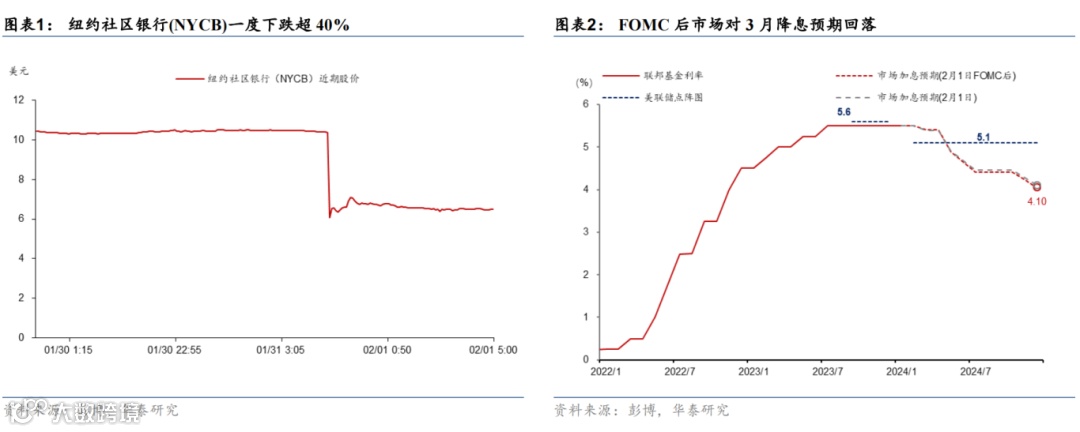 北京时间2月1日(周四)凌晨,联储1月FOMC决议如期暂停加息、基准利率维持在5.25%-5.5%区间,前瞻指引中去除了未来可能继续加息的表述,但鲍威尔表示,需要看到更多通胀回落的数据才有信心降息,基准情形下3月不降息,表态偏鹰。缩表方面,美联储仍然维每月950亿美元(600亿国债+350亿MBS)的缩表上限,但本次会议开始讨论放缓缩表速度(QT taper),3月会议将详细讨论。FOMC会议前纽约社区银行(NYCB)计提损失拨备超预期导致盘前股价暴跌(图表1),打击市场风险情绪,美债收益率下行,美股下跌;偏鹰的FOMC决议公布后,降息预期回落,美债收益率上升、美元走强、美股下跌。截至北京时间凌晨4:30,相较会前,纳斯达克、标普500指数和道琼斯指数小幅回升后因鲍威尔偏鹰言论回落,最终分别下跌-1.0%、-0.9%和-0.8%。;2年和10年期美债收益率均上行3bp至4.27%和3.99%;美元指数上涨0.5%至103.7;3月降息概率从48%下降至38%,2024全年降息幅度上升5bp至145bp(图表2)。