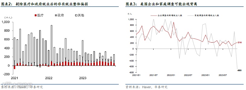 劳工需求是否减速——如果非农就业开始明显减速,则3月降息可能性进一步上升。虽然12月新增非农就业超预期升至21.6万人,但就业市场可能只是“看起来很美”:剔除医疗和政府就业后,其他私人部门新增非农就业维持在相对低位且低于疫情前水平(图表2);失业率虽然维持低位,但家庭调查的新增非农就业下降68.3万(图表3),创疫情以来最大跌幅,可能因兼职就业占比增加,侧面反映就业市场降温。 -