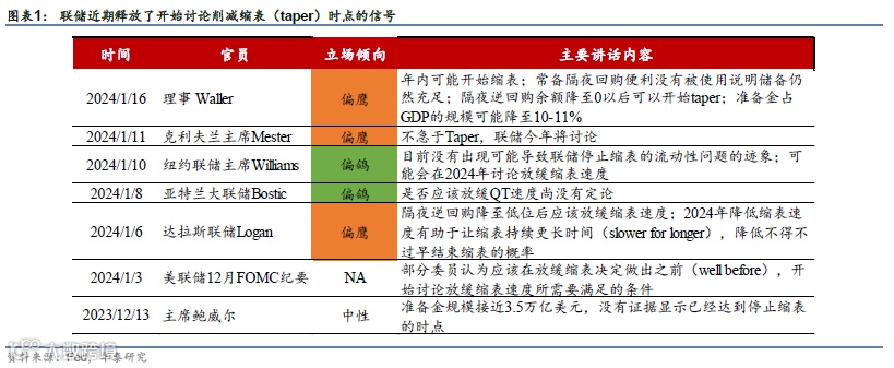 有关缩表:联储近期释放了开始讨论削减缩表(taper)时点的信号(图表1),但也明确指出现在开始就此采取行动为时过早。我们认为,联储可能2季度后更多地讨论taper时点,年中宣布taper,并分多步骤taper,以求在不影响金融稳定的前提下实现资产负债表规模“最小化”。关于这点,我们在近期的专题报告中有更深入的讨论(参见《减缓缩表:联储将如何“摸着石头过河”?》,2024/1/30)。