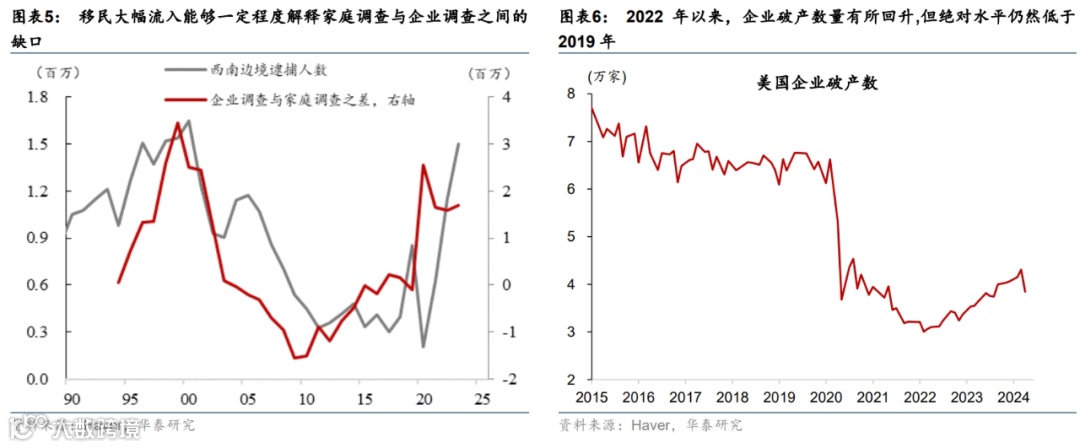 质疑二:非农就业绝对水平显著高于就业和工资季度普查(QCEW)就业以及家庭调查就业。QCEW覆盖95%的就业,理论上更加可靠,但QCEW基于非法移民不能参与的失业保险数据,可能低估了就业;企业调查与家庭调查剪刀差走阔也可能主要是净移民流入导致。