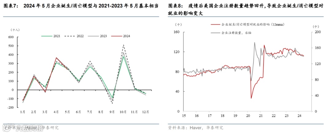 质疑三:劳工部诞生/消亡模型导致非农数据或被高估。企业调查是固定样本的抽样调查,新的企业诞生以及样本中企业倒闭会影响到企业调查的准确性。为了克服企业诞生和倒闭对非农数据的影响,劳工部(BLS)通过企业诞生/消亡模型对非农原始数据进行调整。有文章认为[1],2023年下半年企业倒闭激增,而新企业设立放缓,BLS的企业诞生/消亡模型导致企业调查得到的非农数据被高估。从数据上看,2022年以来美国企业破产数量触底回升,2023年增速位于高位(图表6),但是企业破产数量的绝对水平仍然低于2019年,企业诞生/消亡模型显著推高新增非农就业的概率可能不大。根据BLS提供的数据,5月企业诞生/消亡模型将导致新增非农就业(未季调)增加23.1万,而2021-2023年5月为23.9-25.4万,当前的企业诞生/消亡模型并没有显著偏离2021-2023年的历史波动区间(图表7)。此外,从12个月的移动平均来看,过去12个月,企业诞生/消亡模型推高新增非农就业(未季调)11.2万,而2019年则为8.8万,考虑到疫情后美国企业活力修复,企业注册数量趋势上行(图表8),企业诞生/消亡模型并未显著高估企业调查得到的非农就业。