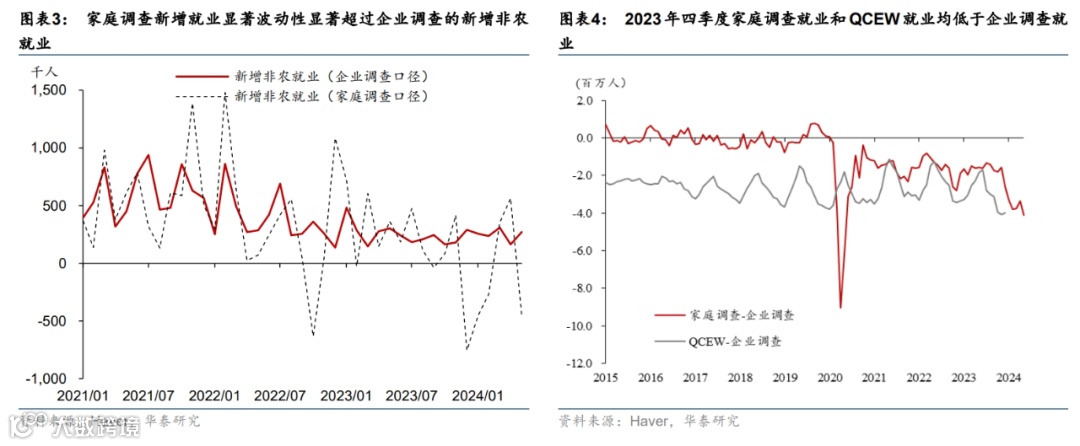 质疑一:5月新增非农就业超预期,但失业率超预期上行。5月美国新增非农27.2万,高于彭博一致预期的18万,但失业率超预期回升至4.0%。这主要是因为新增非农就业来自企业调查,而失业率来自家庭调查(图表2),5月家庭调查就业下降近50万(图表3),导致失业率超预期上行。非农和失业率的分化过去也多次出现,考虑到家庭调查样本偏小,波动更大,企业调查所得到的非农就业数据相对更可靠,失业率的上升或不意味着就业市场在5月份较弱。