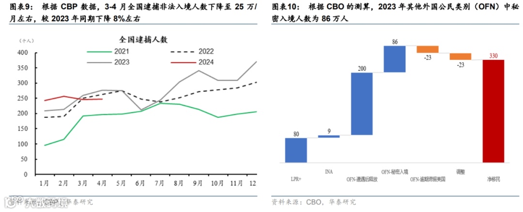 3月以来,移民流入美国速度有所放缓。正如我们此前所分析的(参见《美国:人口流入的宏观影响不容小觑》,2024/4/21),2023年美国净移民大幅增长330万人,大部分来自其他外国公民类别(Other Foreign National,OFN),其中以非合法方式进入美国的移民为主体。但是3-4月移民流入美国的速度有所放缓。根据美国海关与边境保护局(CBP)数据,3-4月全国逮捕非法入境人数下降至25万/月左右,较2023年同期下降8%左右(图表9)。根据媒体报道[1],这可能是因为墨西哥政府担心移民大幅流入美国影响美墨贸易而推出“巴士计划”,即墨西哥政府在美墨边境增设检查站,并利用巴士将墨西哥境内的非法移民运送到墨西哥最南部,减缓这些移民到达美国的时间[2]。