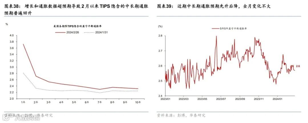1月美国CPI超预期回升,短期通胀预期明显升温,但中长期通胀预期变化不大。1月美国CPI和核心CPI环比超预期回升至0.3%和0.4%。分项来看,核心商品环比收缩0.3%,连续8个月为负,但Manheim指数指示CPI二手车分项环比2月可能边际反弹;1月等价租金超预期回升部分来自涨幅较高的单户住宅权重上升,但Zillow和Apartmentlist租金指数显示房租整体仍然在降温。1月PCE和核心PCE环比回升至0.3%和0.4%,符合预期。通胀预期方面,美国增长韧性较强导致TIPS隐含的短端盈亏平衡通胀率一度上行接近150bp,但5年5年盈亏平衡通胀率维持在2.6%的水平,整体保持平稳。