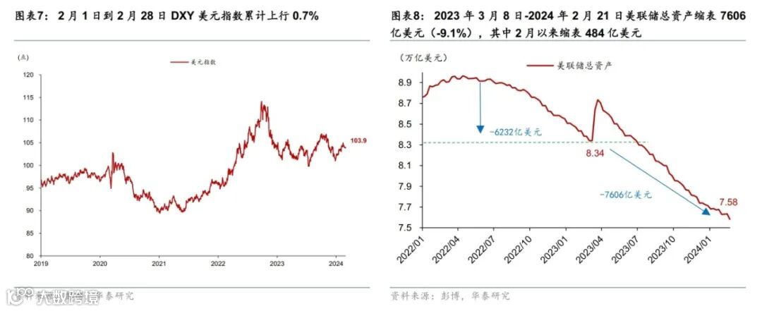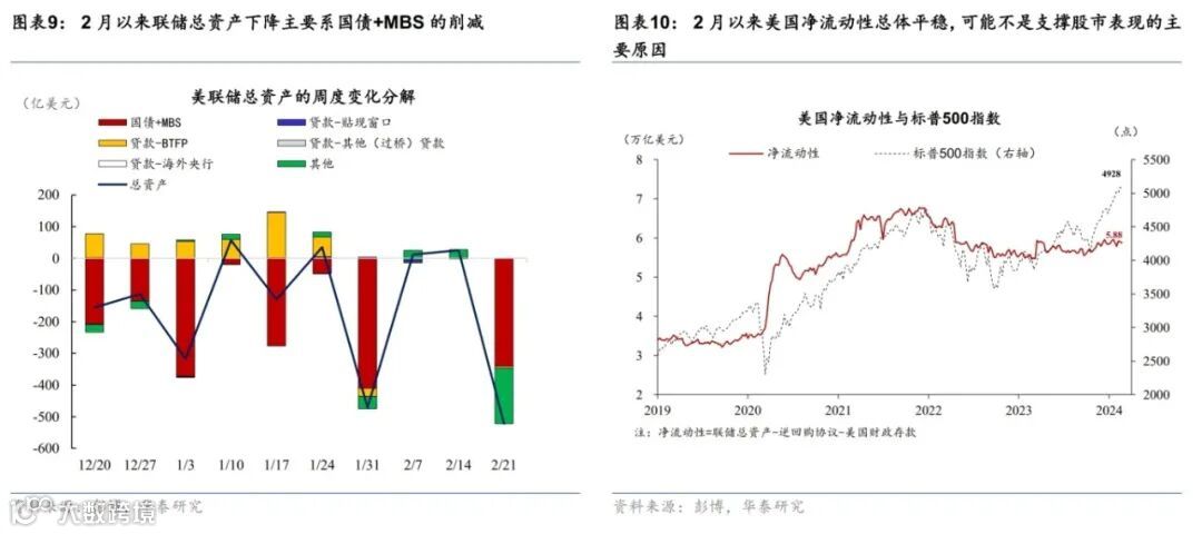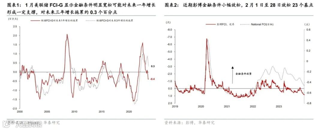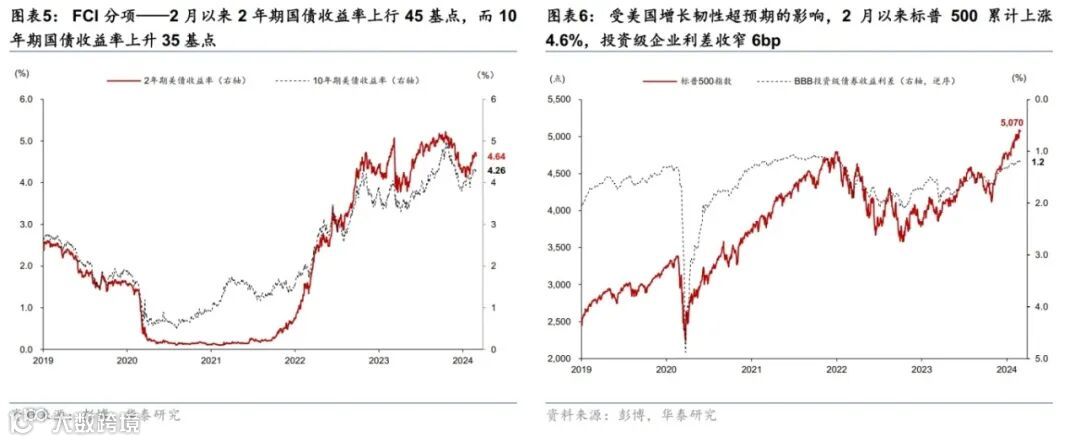 尽管降息预期回落导致美债长端利率上行,但美国科技股财报超预期提振美股表现,金融条件变动不大。降息预期回落推高美债长端利率,2月以来,2年和10年美债收益率上行45、35个基点至4.64%、4.26%。同期,美股和美元均上涨,信用利差收窄,其中标普500累计上涨4.6%,美元指数升值0.7%至103.9,投资级企业债利差收窄6bp至1.22%。高盛金融条件指数2月以来累计放松3bp,为2023年以来较为宽松的水平。其中,长端利率、汇率、信用利差和股票市场分别贡献13bp、3bp、1bp和-19bp。