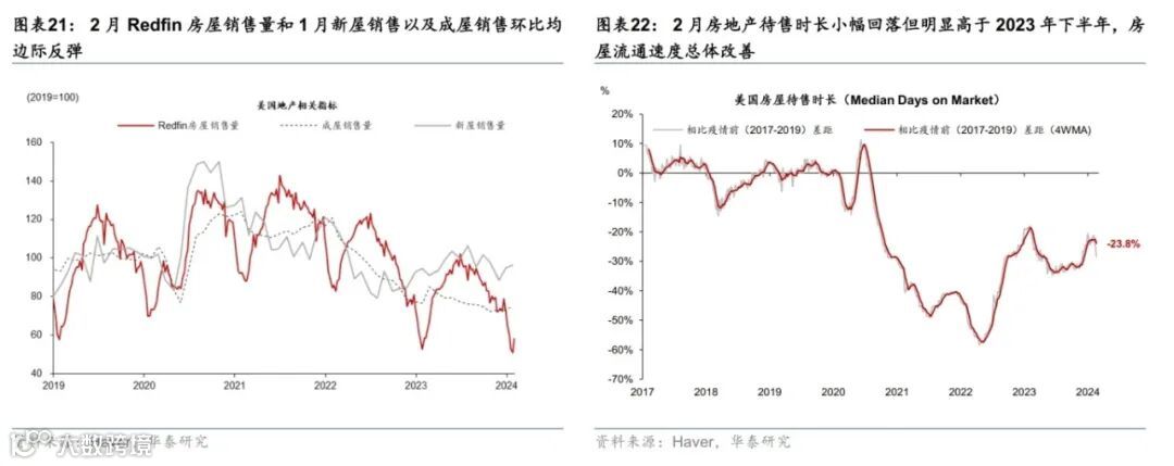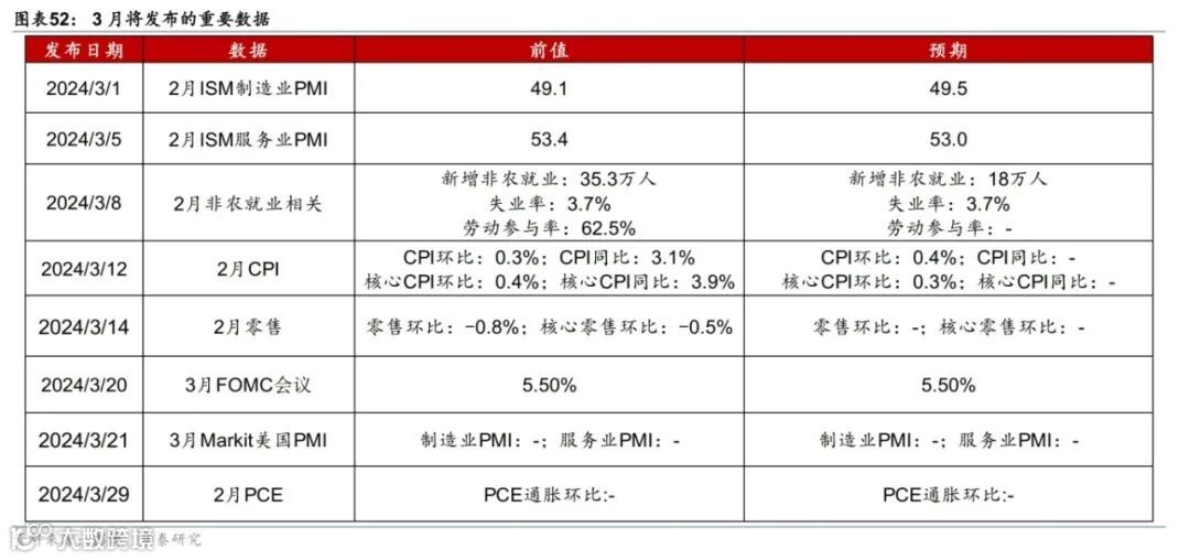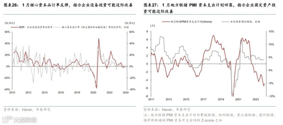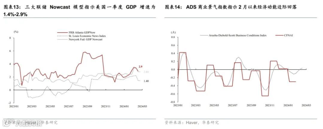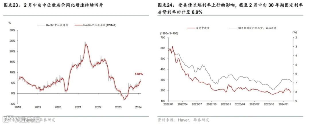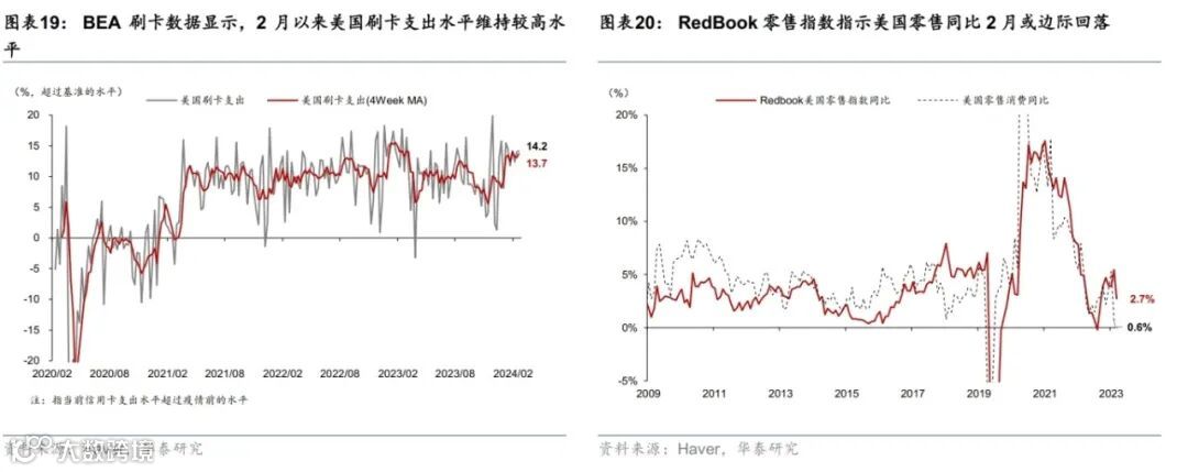 美国名义增长预期上调,消费动能延续,地产有所改善。受美国经济数据超预期提振,彭博对美国2024年GDP增速的预期从1.6%上调至1.9%。消费方面,四季度GDP实际个人消费季环比折年超预期上修至2.8%;多重因素叠加导致美国1月零售环比收缩0.8%,大幅低于彭博一致预期(-0.2%),但1月数据噪音较大,估计2月美国零售增长将较1月明显反弹;2月BEA刷卡消费较1月进一步回升,创2023年3月以来高点。地产方面,30年期固定房贷利率回升至6.9%,房贷申请量持续低迷,1月新屋和成屋销售均反弹,但可能受1月寒冷天气拖累,回升不及预期。投资方面,1月核心资本品订单反弹,指示企业设备投资可能边际改善。