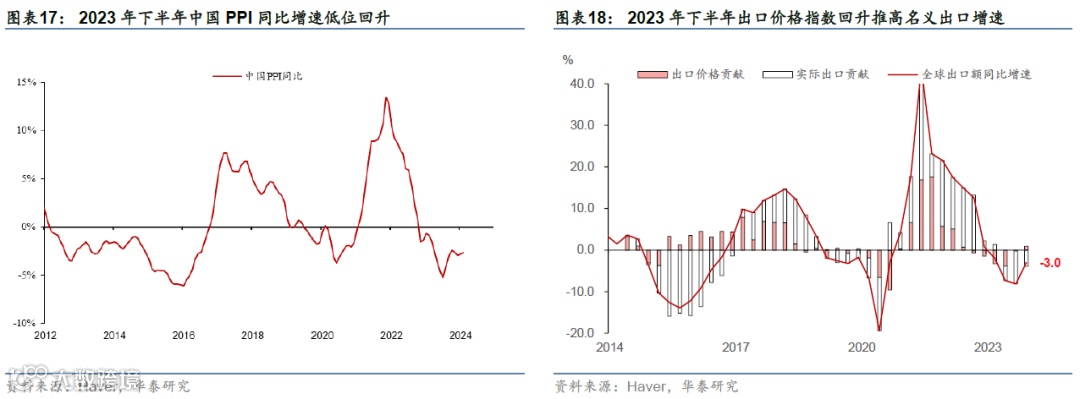 原因3:2023年下半年来PPI有所企稳,一方面,出口价格指数企稳推高名义出口,另一方面,价格止跌降低垒库的不确定性。2023年下半以来,中国PPI同比增速低位回升,表现出企稳迹象(图表17)。一方面,2023年下半年油价同比低位回升,而美元指数同比高位回落,两者共同推高了出口的价格和名义出口增速(图表18)。另一方面, 2023年以来,随着通胀明显回落,垒库的不确定性下降。