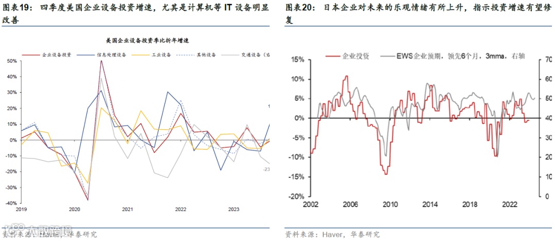 4. 美日制造业企业资本开支上行有望边际提振企业部门商品需求,居民部门商品消费也有所修复。2023年四季度以来美日企业的设备投资,尤其是计算机相关的高附加值设备需求较强。此外,居民实际收入增长回升支持商品消费。